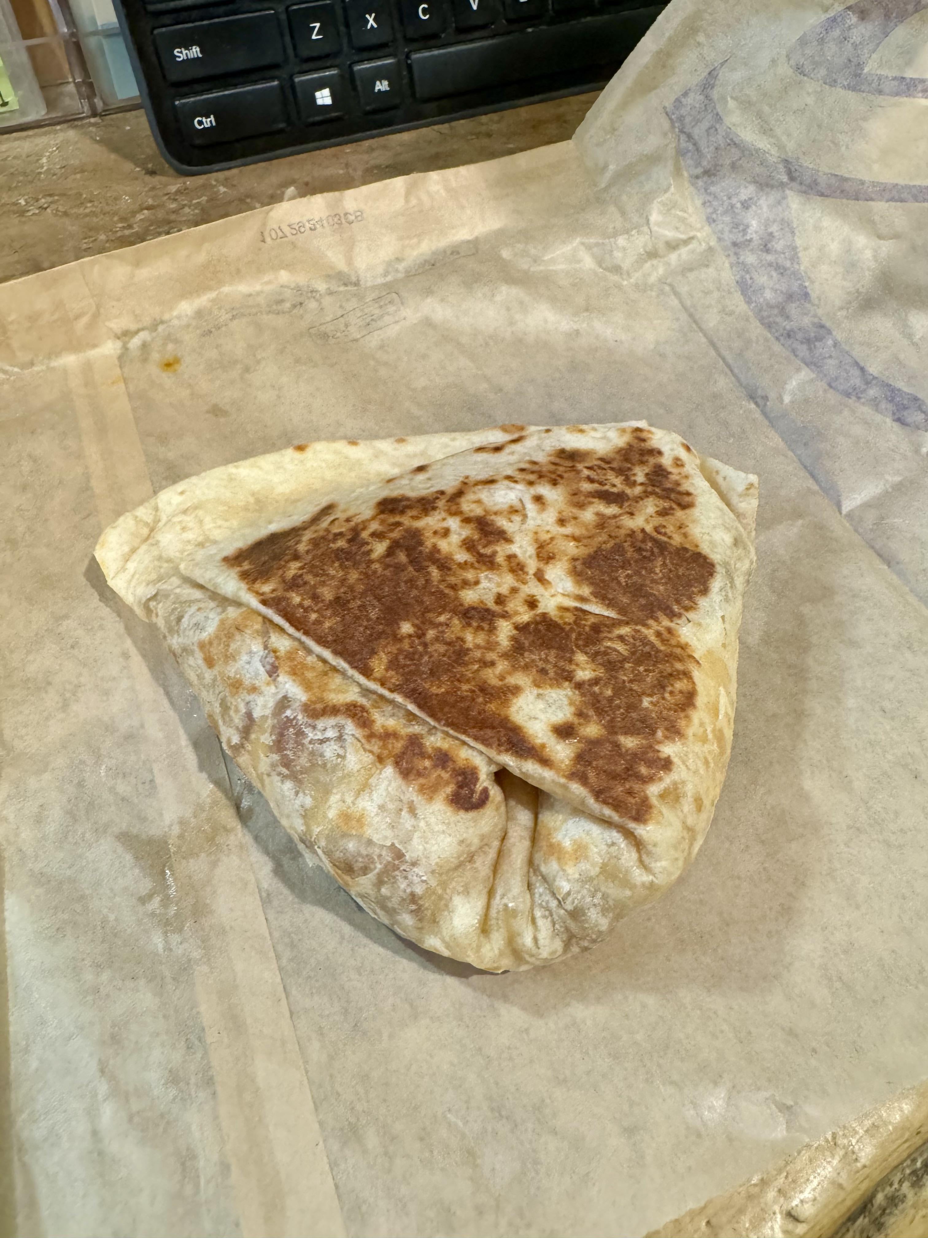 Got mine with potatoes instead of beef and added chipotle sauce. Killer. The cheese was actually melted unlike most of my quesadillas.How is this like half the price of the quesadilla?by kennethsime Write A CommentYou must be logged in to post a comment.