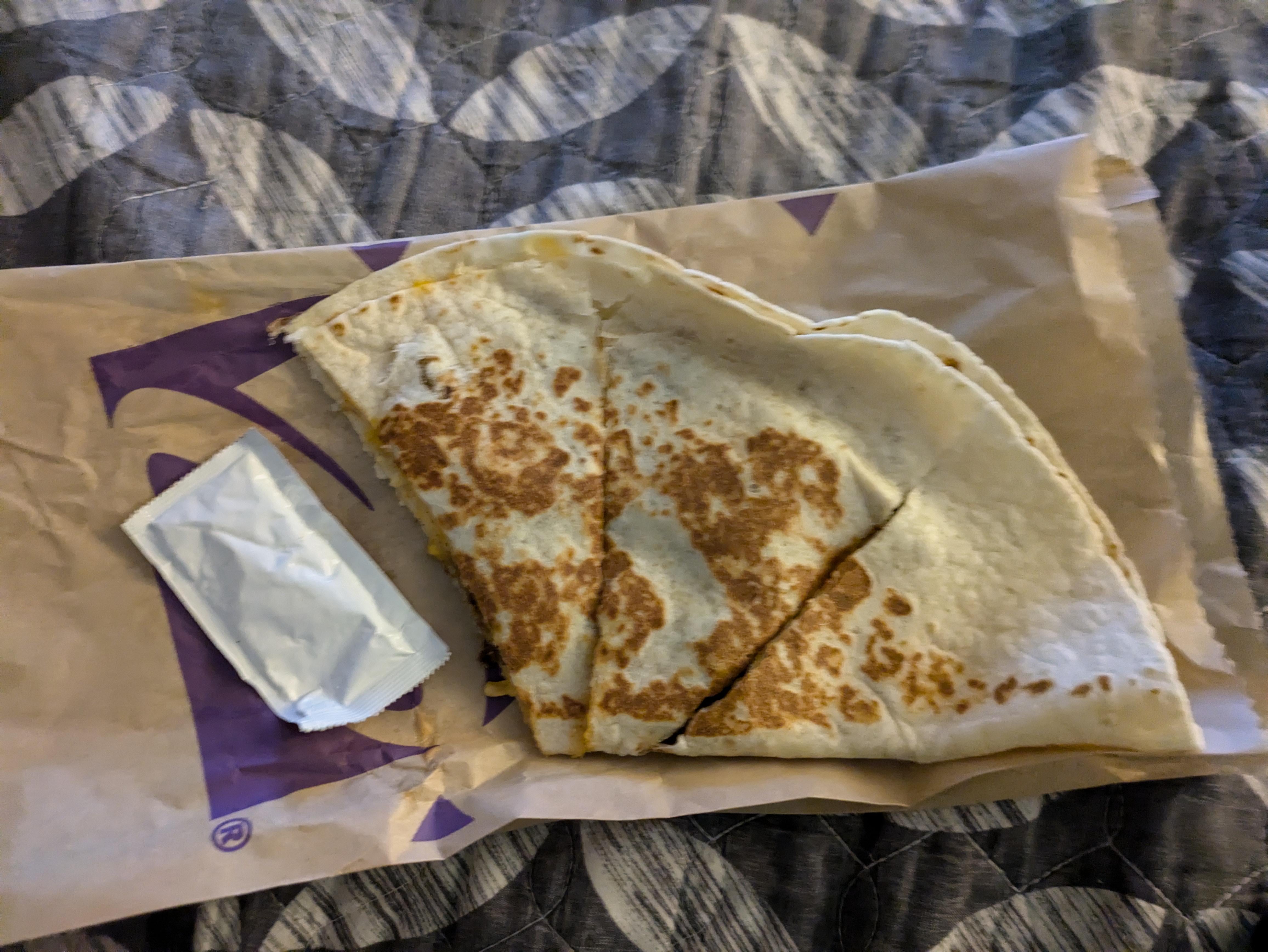 Got the $8 deal with two steak quesadillas tonight. This thing is tiny…maybe a scoop of meat and cheese in each one. by masterz13 Write A CommentYou must be logged in to post a comment.