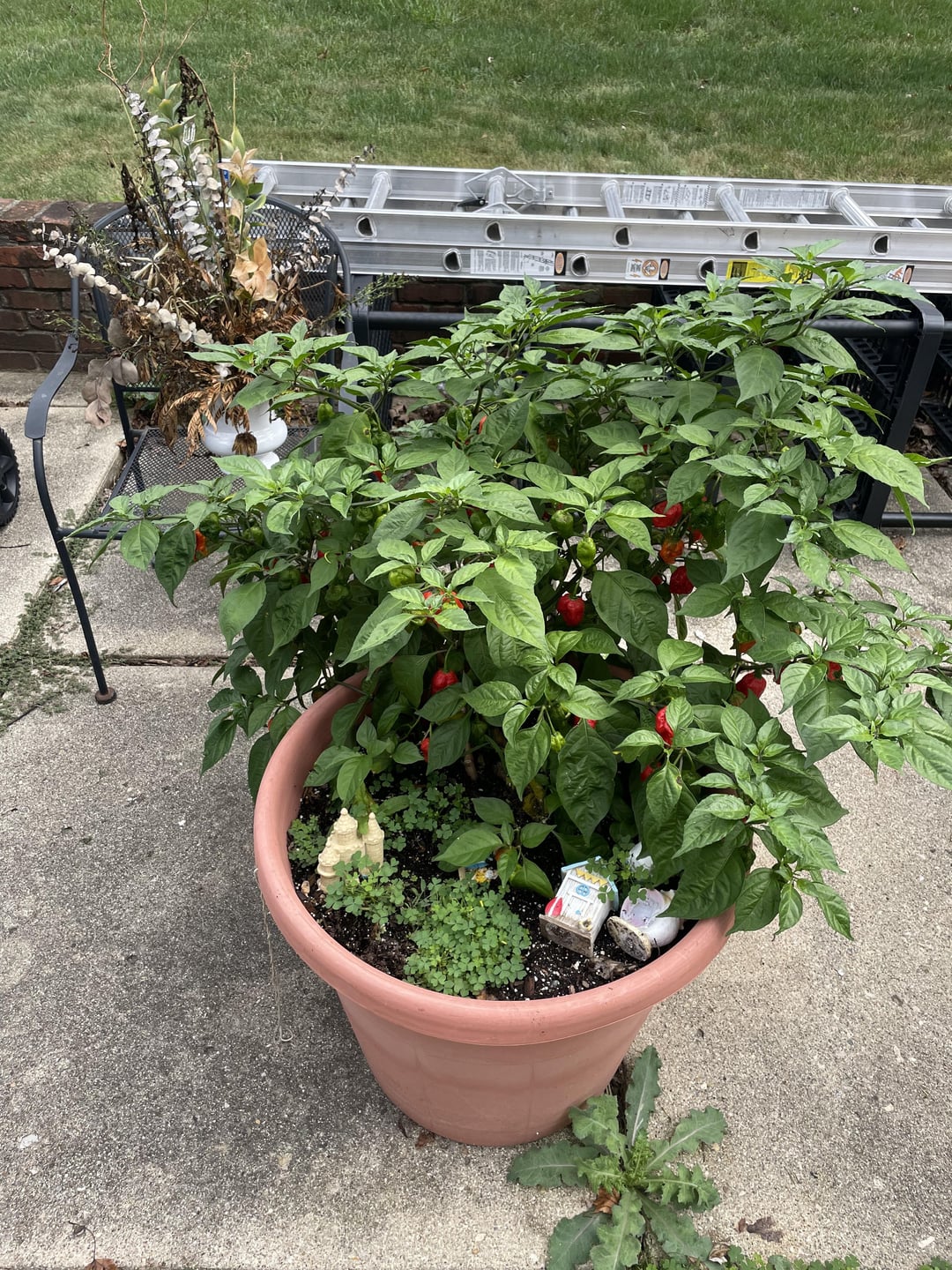 This plant was wintered and then transplanted to a new bigger pot when a family pet bearded dragon died it was burried in this pot and this plant has been growing all summer long it seemed a nice way to honor the family pet I’ve gotten many peppers off of it 50+