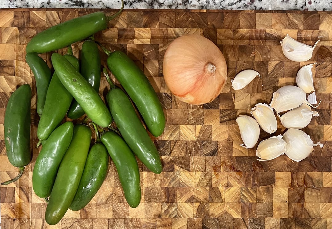 I wanted to keep it simple the first time, so just serranos, an onion, a head of garlic, and white distilled vinegar.