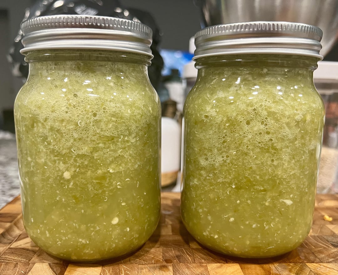 I chopped up the ingredients, boiled them in vinegar for a few minutes to kill any bacteria or pathogens, boiled the mason jars and lids, blended it all up and jarred it.