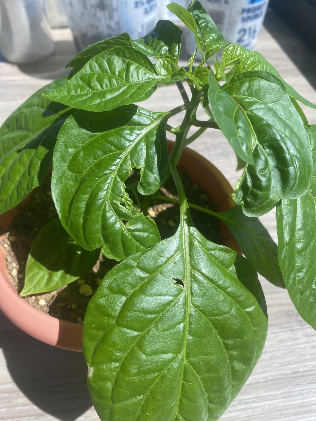 Hi! Hoping someone can help me identify what’s happening to my pepper plant here. This is a red habanero plant that has otherwise been doing great – just these weird chunks out of the leaves. Important note – this is one of a handful of fully indoor pepper plants I’m growing. No visible issues on any of the other ones so far. Any ideas?