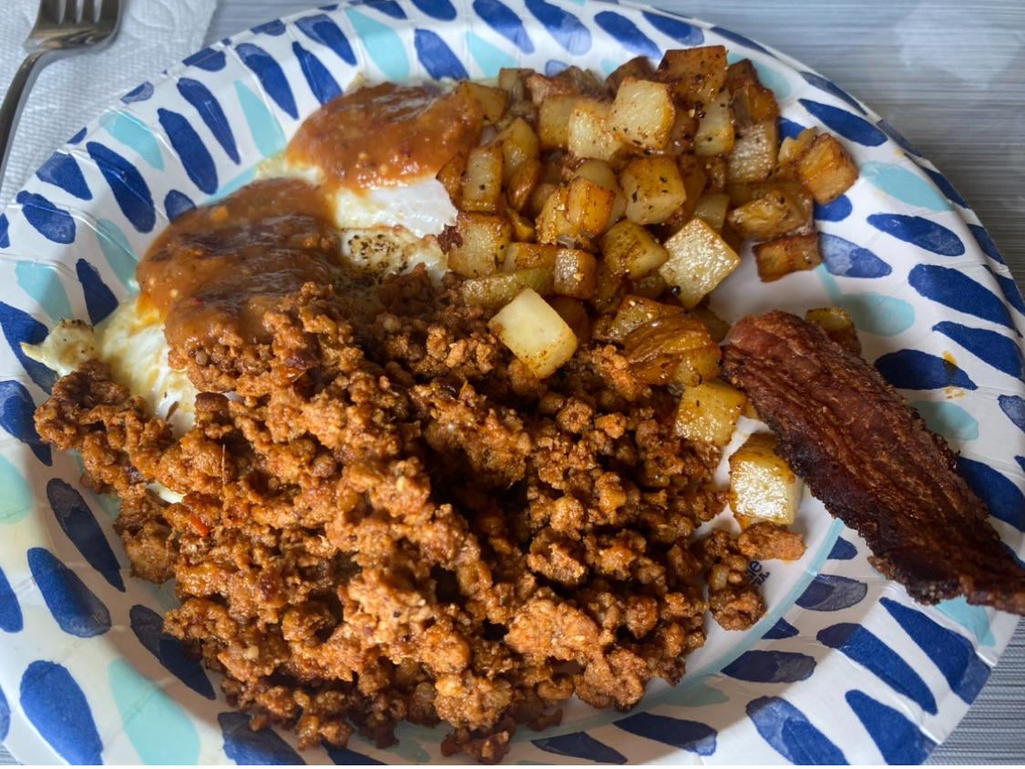 Desayuno servido, chorizo, tocino, patatas y huevos y salsa roja