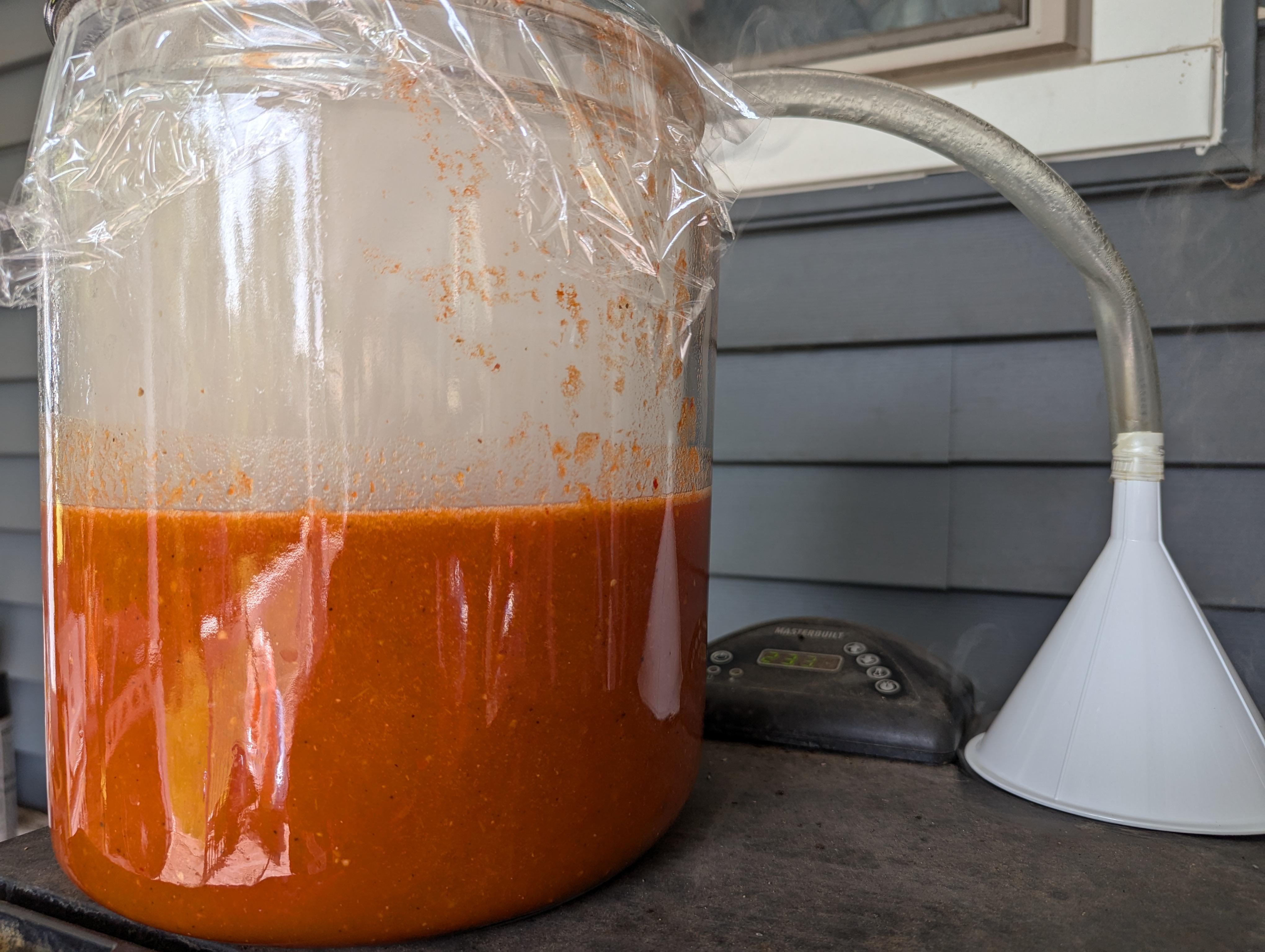 Peach and bourbon sauce with home grown reaper, ghost, habanero, serrano, jalapeno, hot banana, red bell, and mad hatter peppers. Peach and oak smoke to finish it off.