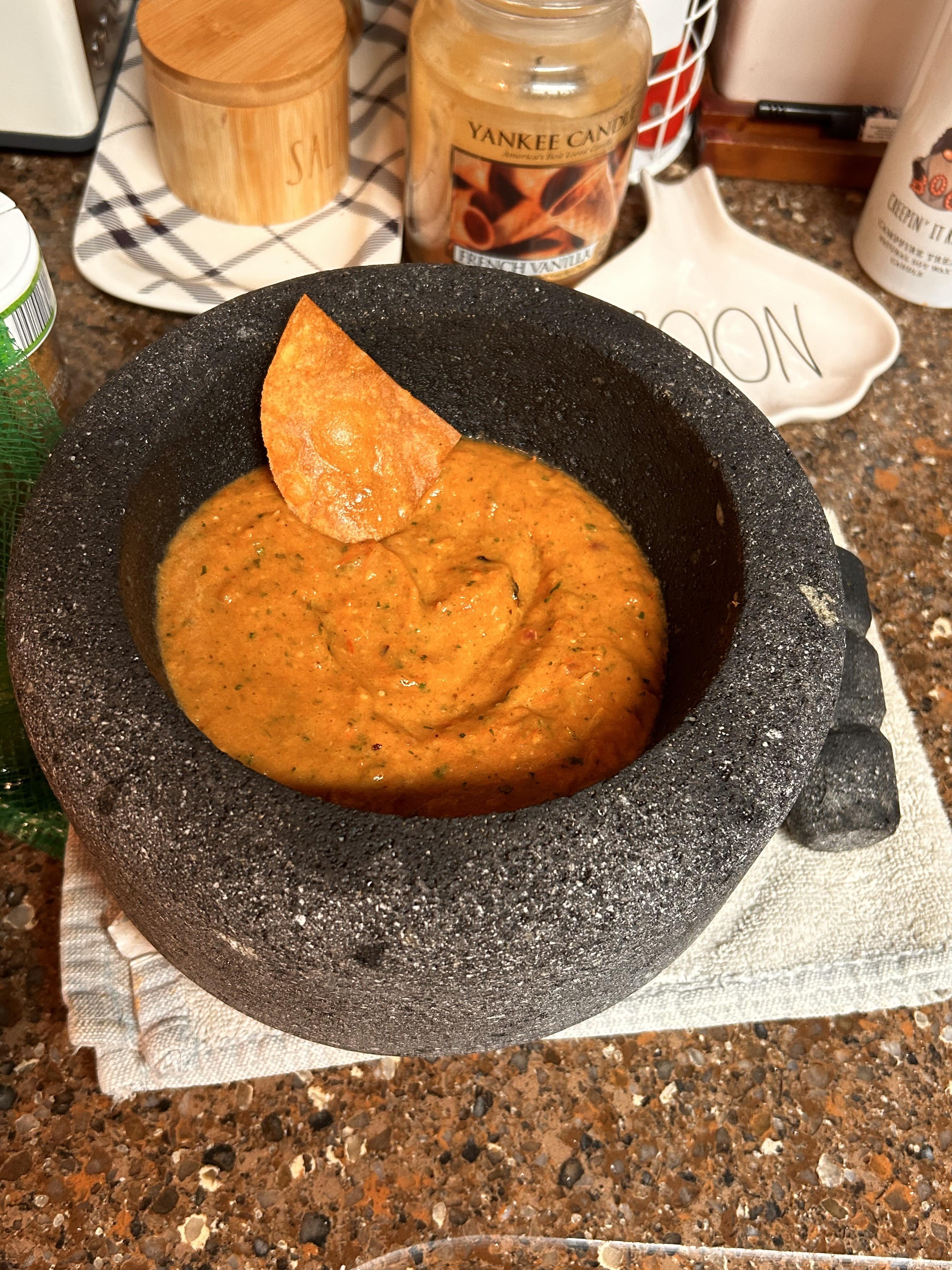 All pulsed in a processor, poured in a molcajete for æsthetic (I promise I actually use it to make guacamole) and served with homemade corn tortilla chips fried in peanut oil.