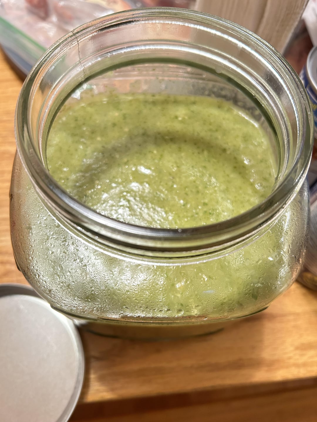 The next is about 2lbs tomatillos, a green jalapeƱo, six green habaneros, 3 cloves of garlic, a full white onion, a whole bunch of cilantro, juice of 8 limes, a bit of bouillon, salt to taste. Again, not super spicy to me, but this one has a creeping heat and the sort of bright tang I love.