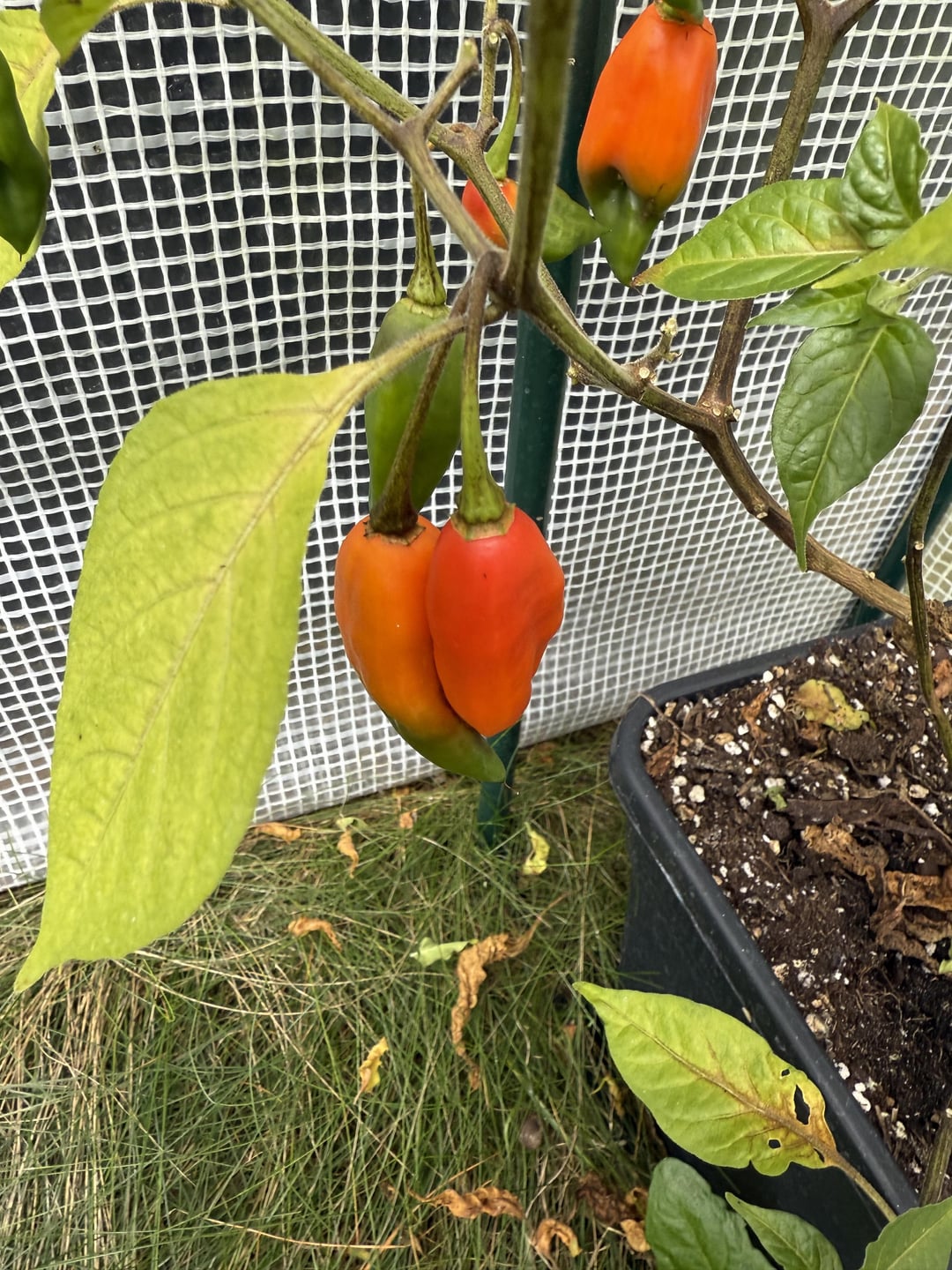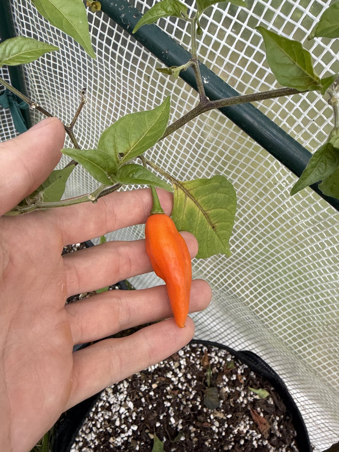 I planted Purple ufo, Habanero lemon, Habanero orange, Aji pineapple, Aji Charapita, Aji mango stumpy, Tangerine tiger, Thai chili, Trinidad Scorpion and Cumari. They have all been standing very close to each other. This doesn’t look like any of them to me. What do you think?