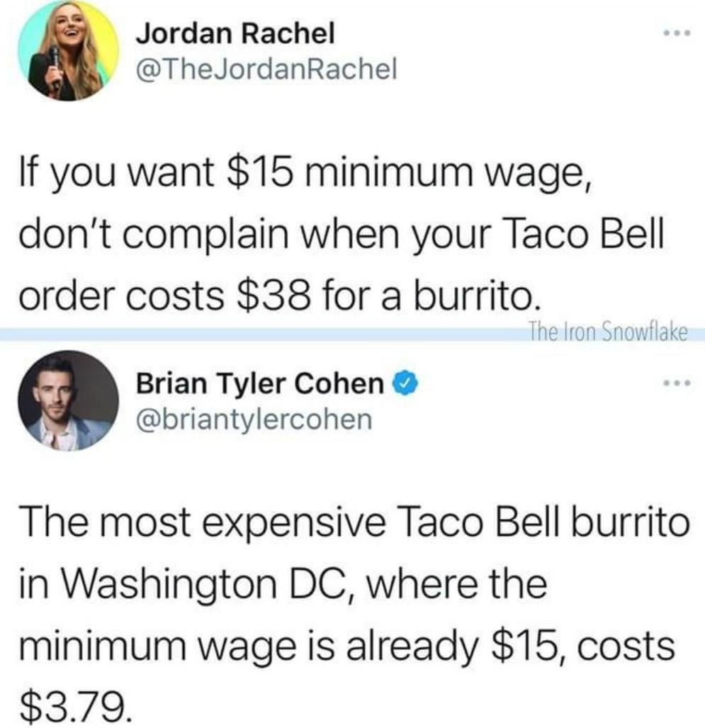 Did a quick fact check, the most expensive “burrito” from Taco Bell in DC is $5.89 double steak grilled cheese burrito. Even though this post is old, it looks like the price went up when min wage went up in DC. Also, both of the people tweeting are dumb