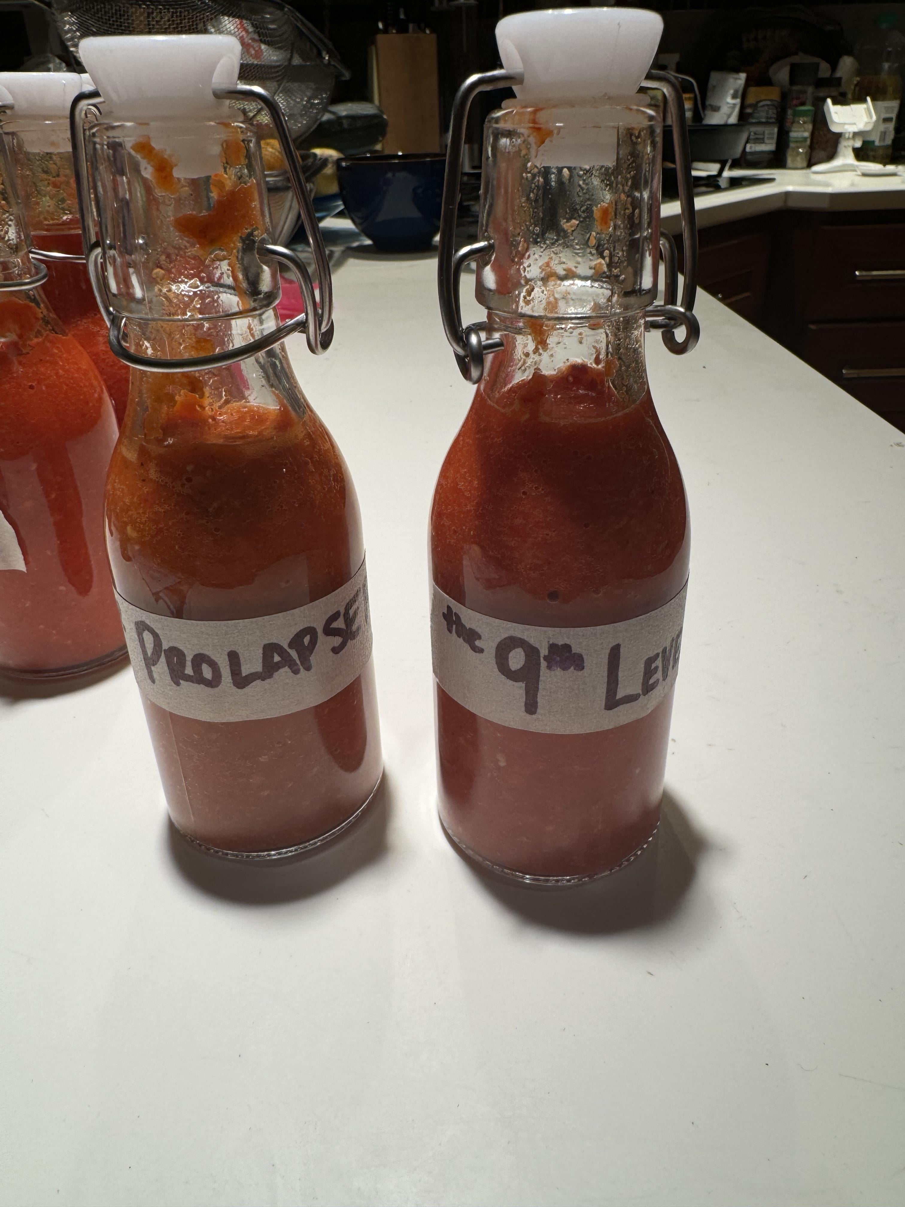 I’m also not allowed to name things anymore after this. Anyways let me begin by describing the lovely prolapser. It was my left over ghosts and Trinidad scorpions with a bit of jalapeños from my garden. Fermented in a 5% salt brine with 3 onions and 3 bulbs of garlic for almost 2 weeks. Blended with a dash of apple cider vinegar to ensure some self stability. The other dubbed the 9th level after Dante was made exclusively with Trinidad scorpions in the same style brine with a dash of Prosecco vinegar and fresh lemon juice, again for stability in the long run. I’ve thoroughly enjoyed my experience with fermenting hot sauces and can’t wait to experiment more in the future!