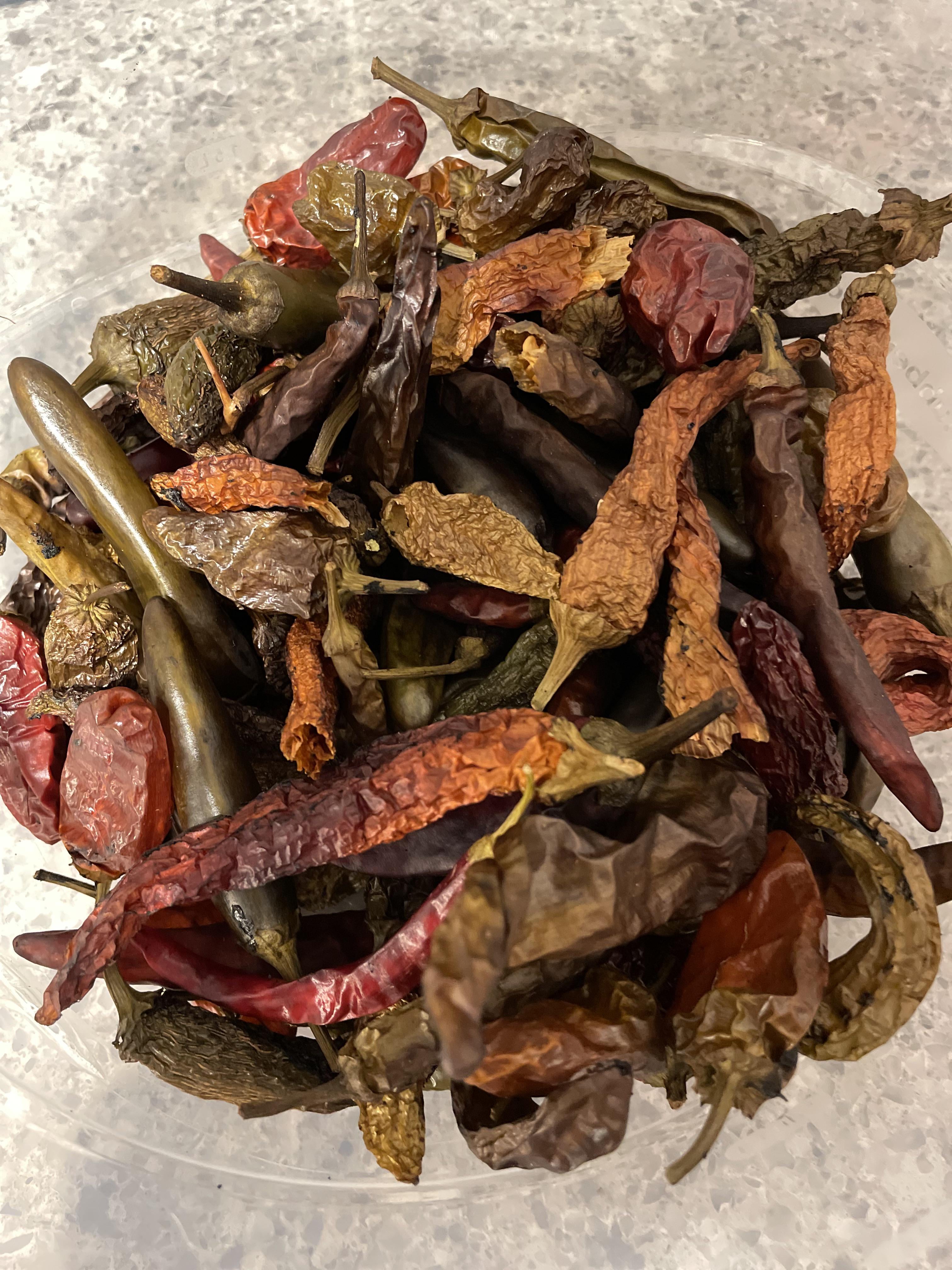I couldn’t be happier with this outcome! My kitchen smells divine… I’ve got a solid mix: jalapeños, hatch, Gochugarus, rattle snakes, purple bleeders, cayennes, ghosts, Thais, scorpions, reapers, and rams horns.
