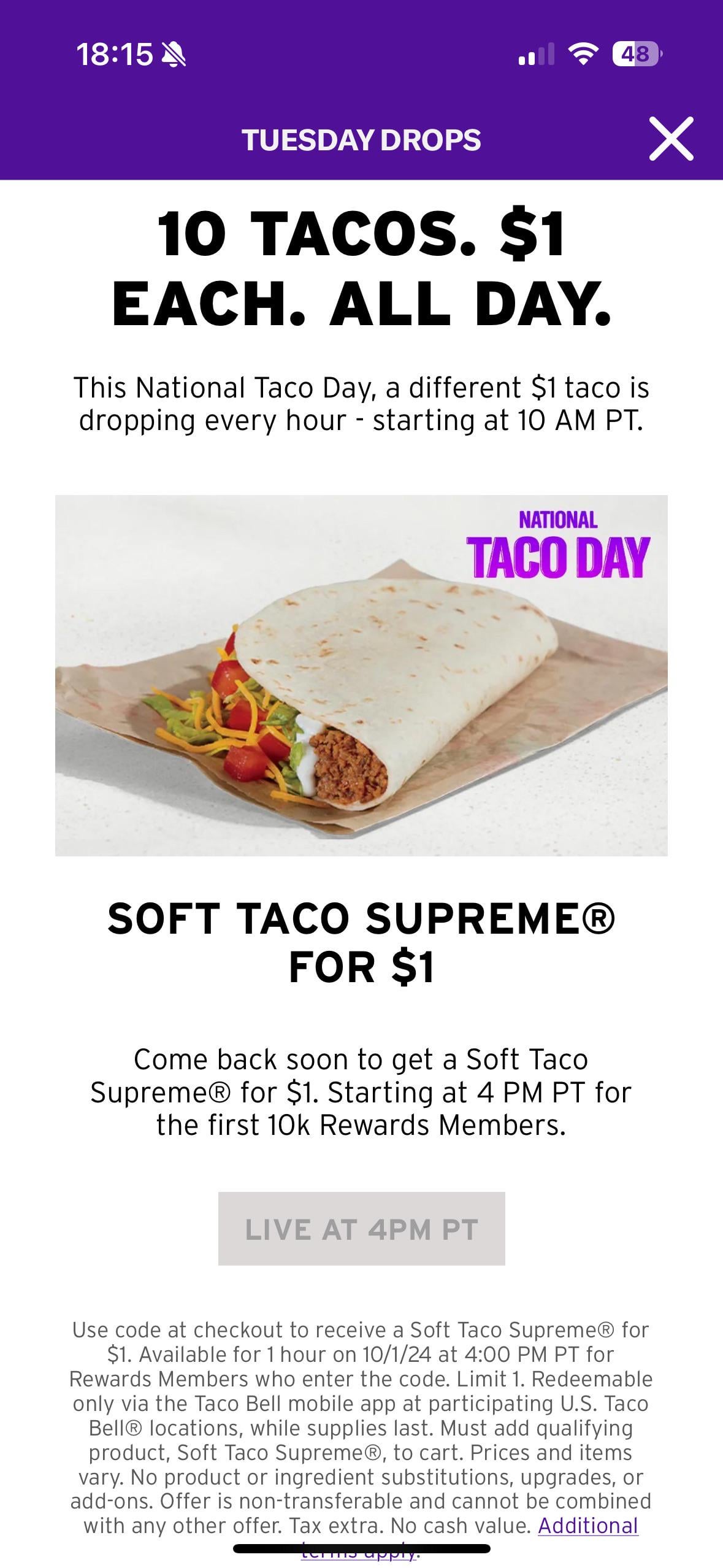 Am I reading this right that the coupon, every hour, is only for the first 10,000 “rewards members” people who claim it? What about everyone after the first 10,000 people? With ~7.5k locations in the US, it seems it’s like 1.3 persons per 1 location per 1 hour can get a $1 taco for 1 day. 🤷♂️