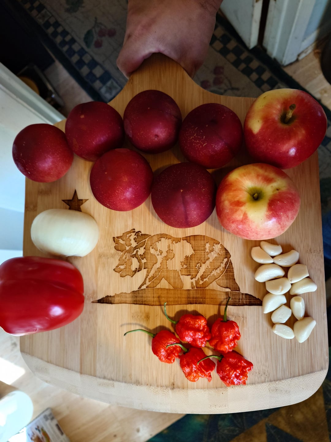 Chop all solid ingredients from pic into a pot. Add 2 cups water, 2 cups vinegar, 2 tbsp salt, 2 tbsp brown sugar. Bring to a light boil, then simmer till everything is soft. Blend, strain, bottle.