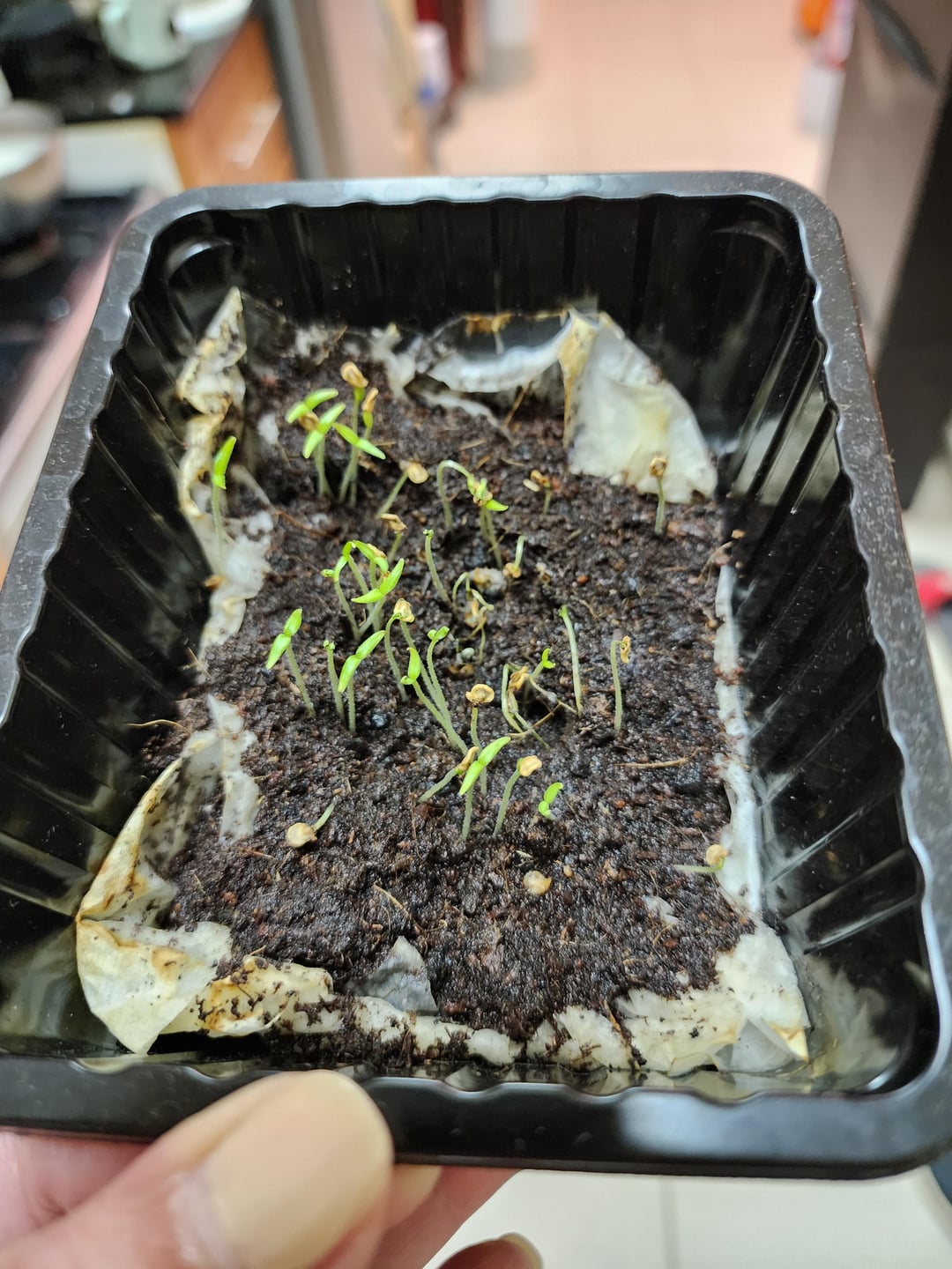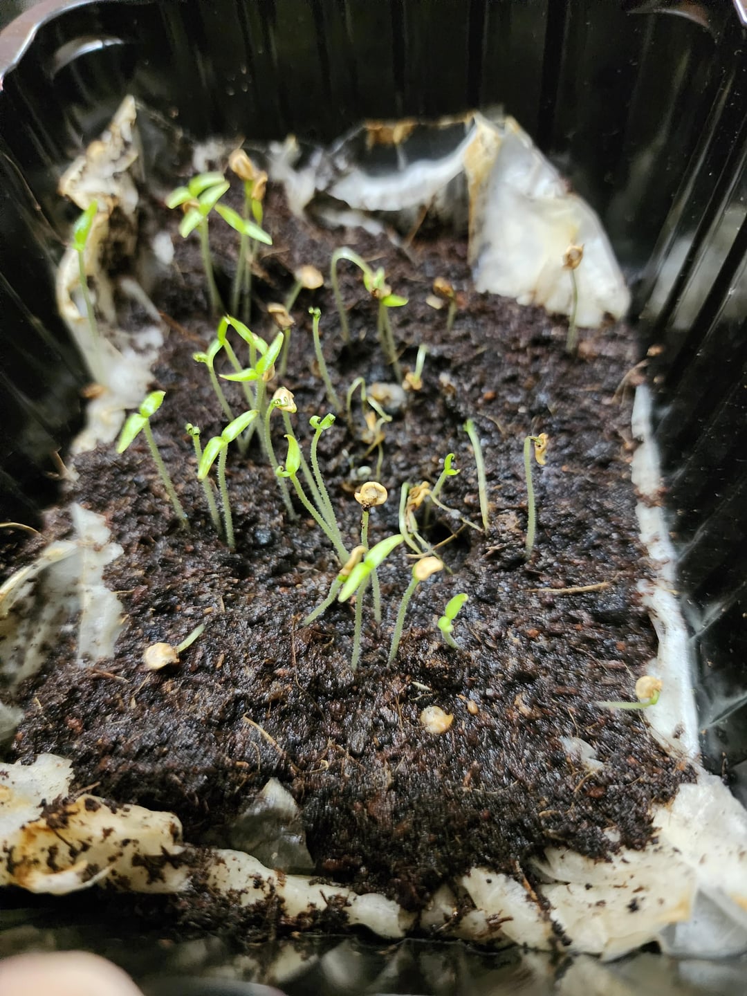The kitchen tissue underneath is what made them sprout at the start under a pierced plastic wrap and so I only added soil about 8 days ago. This worked because I had accidently tried this with pumpkin seeds and it sprouted and tomato seeds as well. I took those to my cousins who have a garden. The tomatoes didn't survive but the pumpkin I believe thrived.