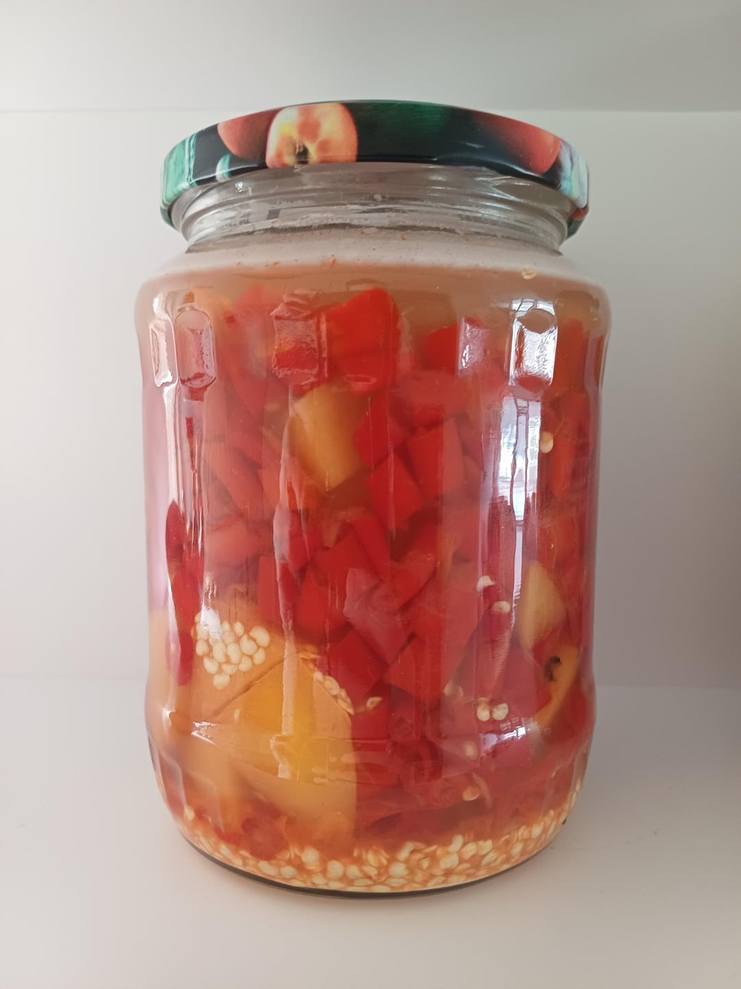 I decided to give lacto-fermentation a go around a month back and this is the result: a bird's eye chilli-peach hot sauce.