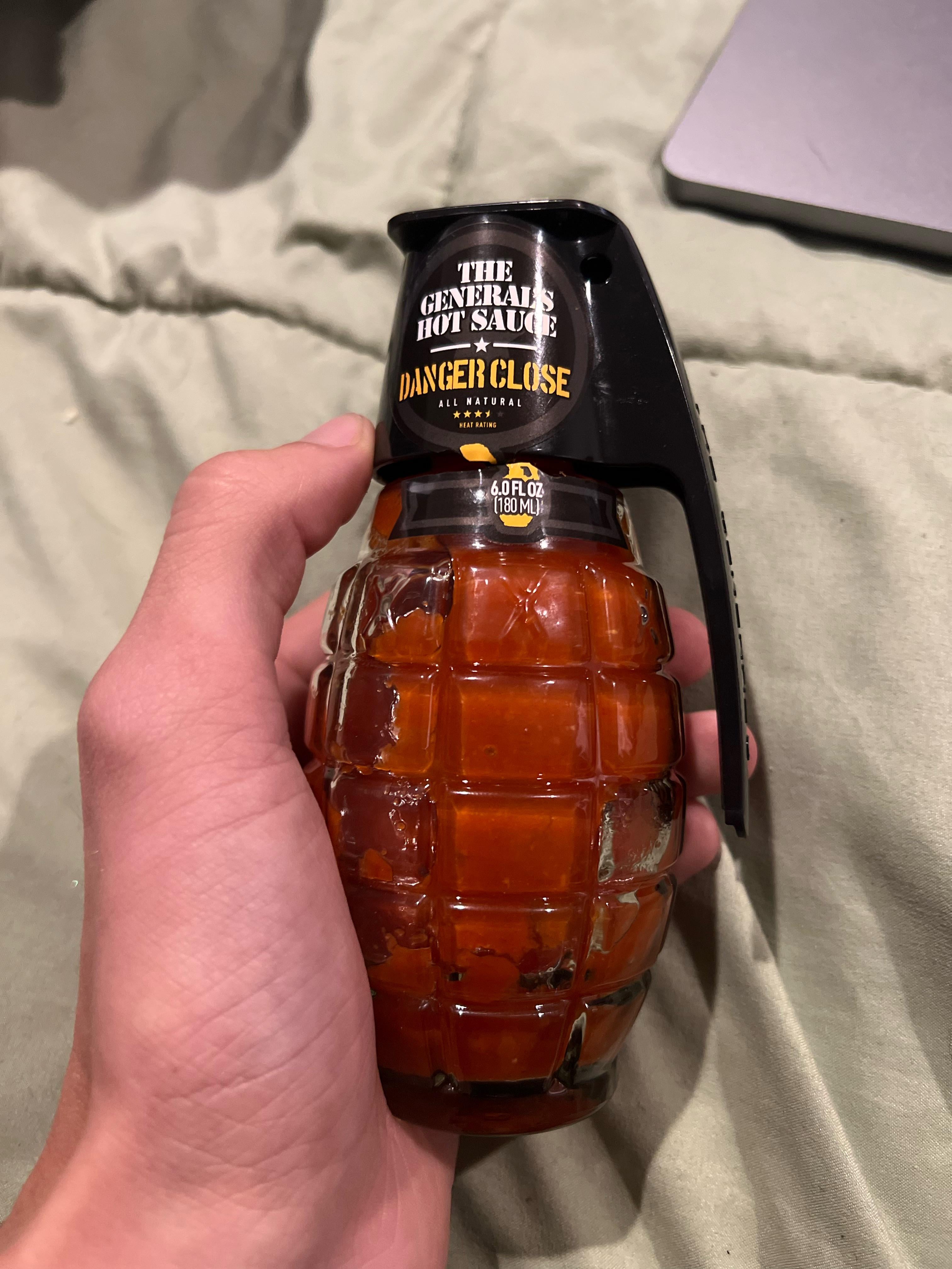 This stuff is surprisingly good for being sold in a grenade bottle lol. Ingredients in order: american grown cayenne and habenero peppers, distilled white vinegar, salt, garlic. This is my first sauce with peppers as the main ingredient and Im sold. The pepper taste is amazing and its a much nicer spice than something with vinegar as the main ingredient.