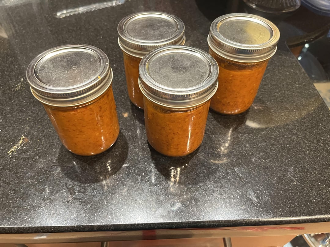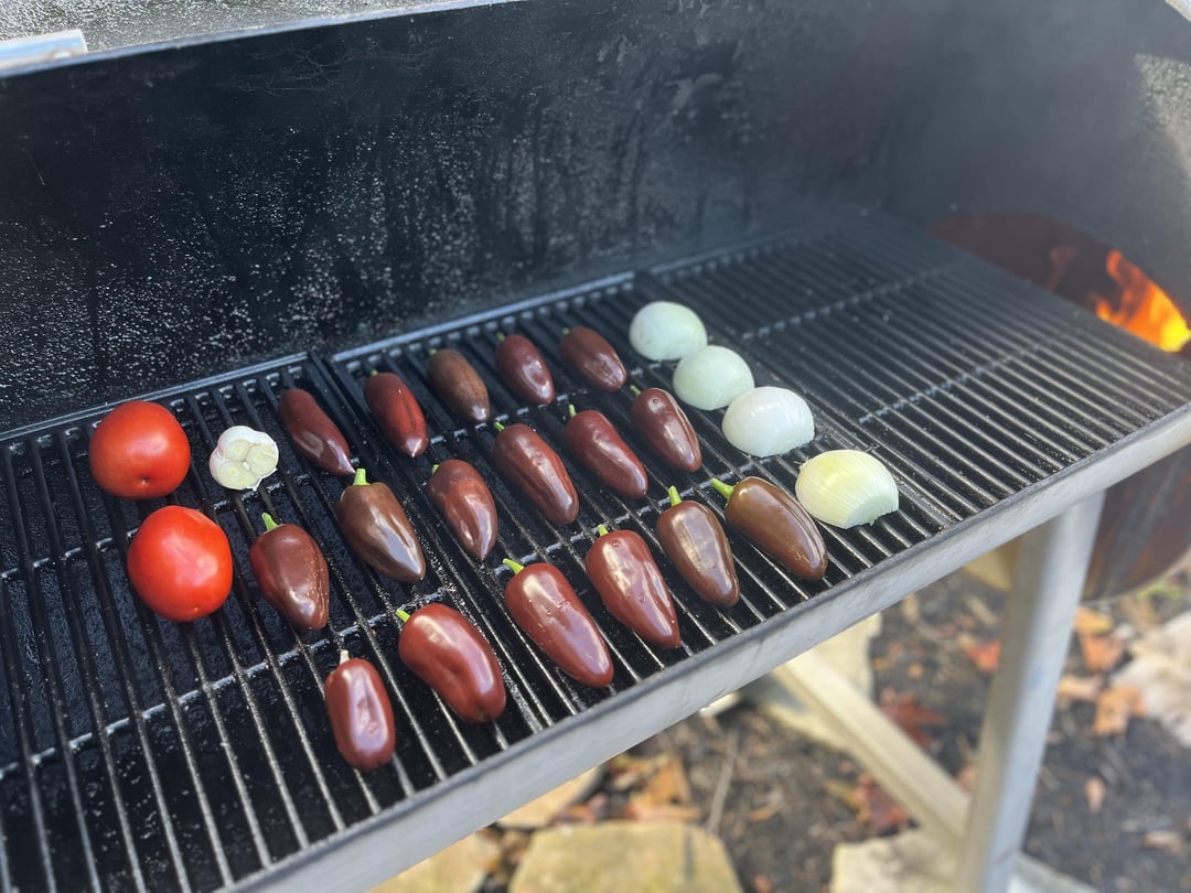 Smoked salsa roja with my garden jalapeño brown. They’re quite mild peppers but very flavourful. I smoked the peppers, onions, tomatoes and garlic, then blended it with olive oil.