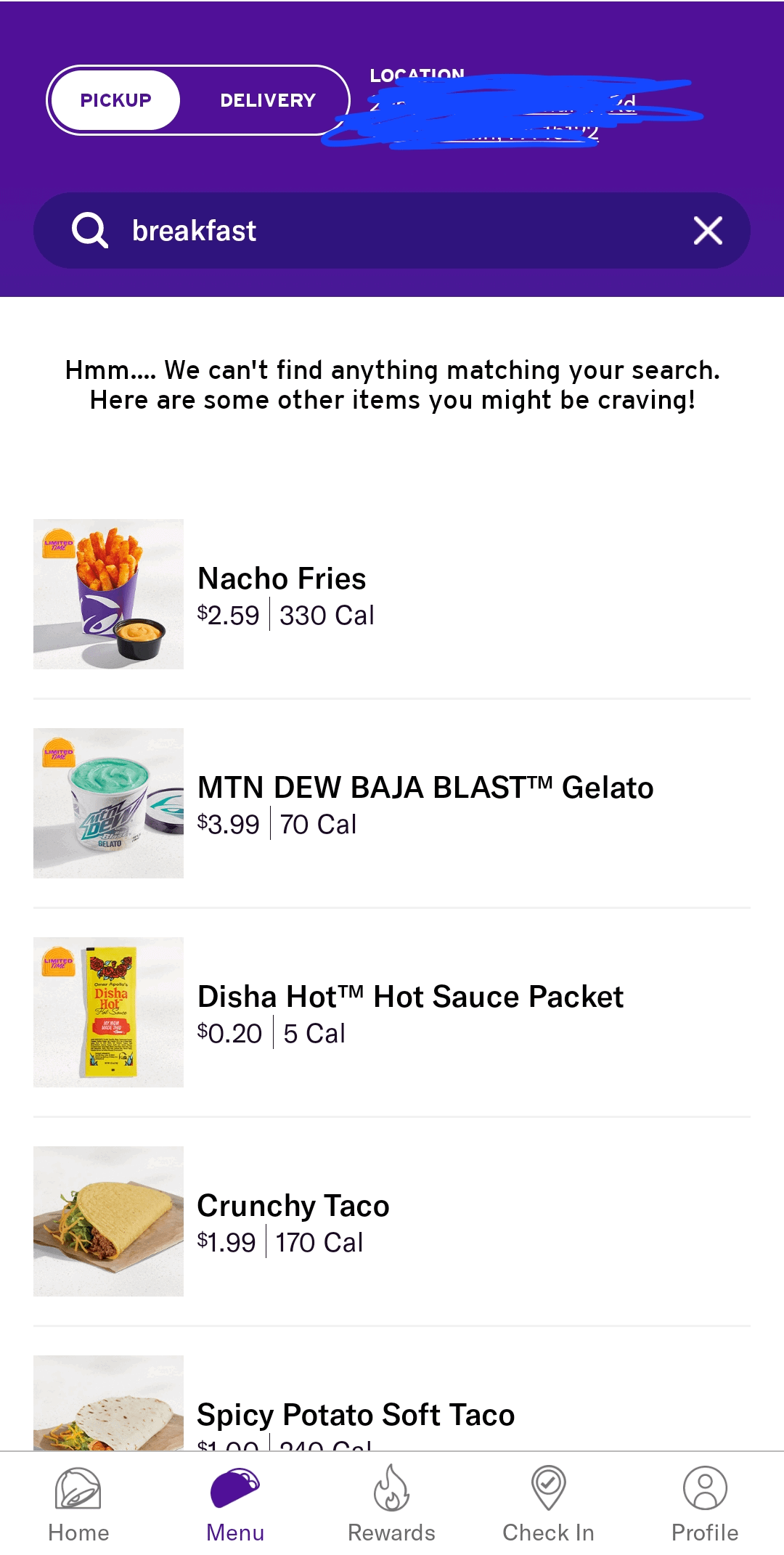 So I usually order taco bell breakfast when hungover, but I have no option on my app. The rewards I have that are breakfast items say not available at my location. I have gotten these items at my local taco bell many times so I'm very confused.