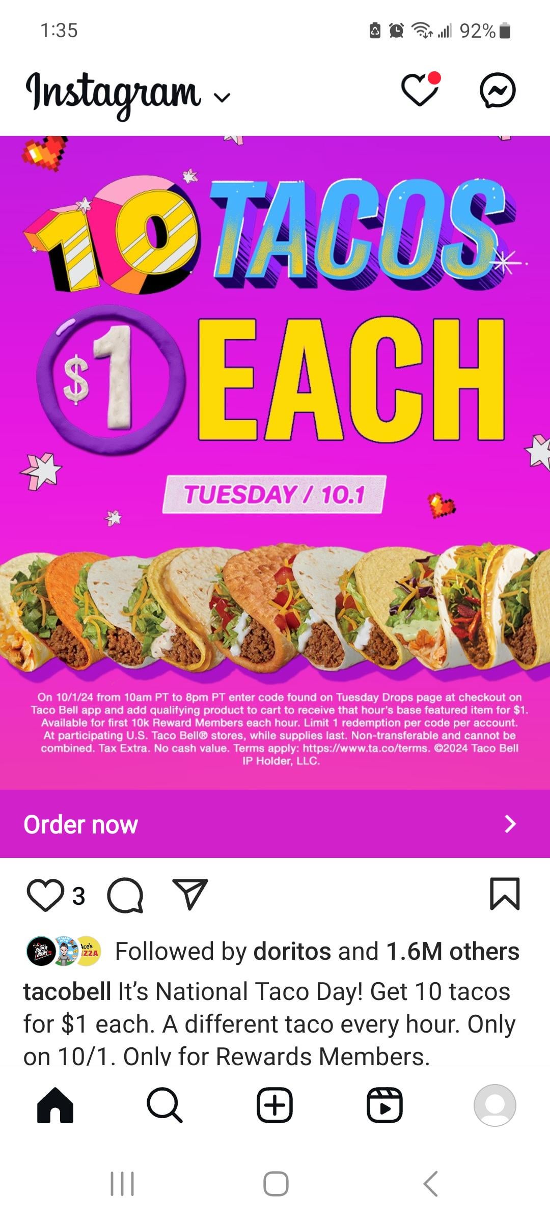 Taco Bell announced this weeks Taco Tuesday deal. They will be selling a different Taco for a dollar each hour beginning at 10am and ending at 8pm. Limit 1 Taco per account valid for the first 10,000 reward members. by Final_Economics_9249 Write A CommentYou must be logged in to post a comment.