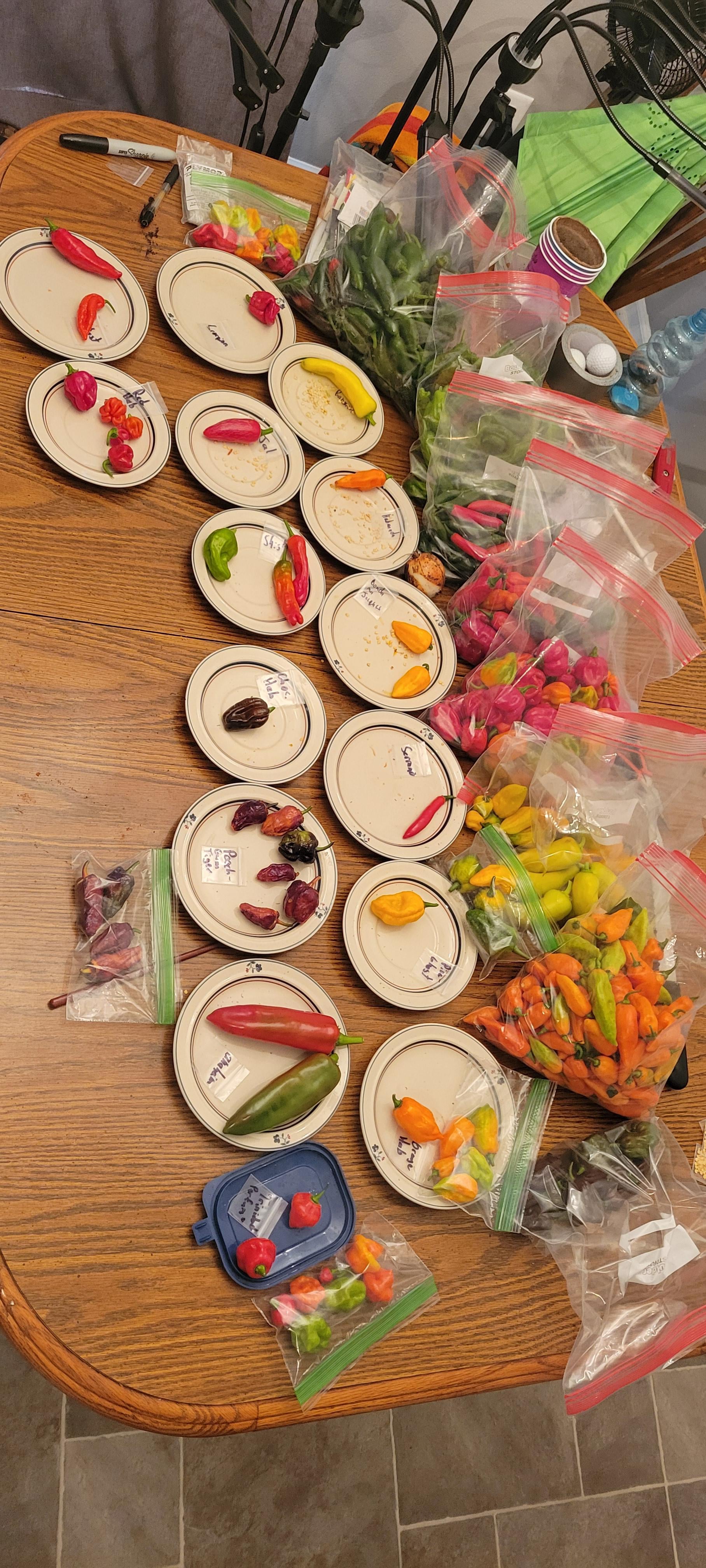 Last major harvest of the year as it's going to cool down here in 4b. What an insanely rewarding and informative year. I grew scorpions, ghosts, pineapple ghosts, red habs, orange habs, chocolate habs, jalapenos, serranos, bananas, anaheims, and shishitos as the main plants. When I bought the pineapple ghost seeds the seller threw in the trinidad perfumes and bonda ma jacques, both of which ended up being my favorites ironically. The peachgum tiger is currently F2, but I saw minimal trait differences throughout the plant. Absolutely gorgeous pod and plant though. 'Till next year!