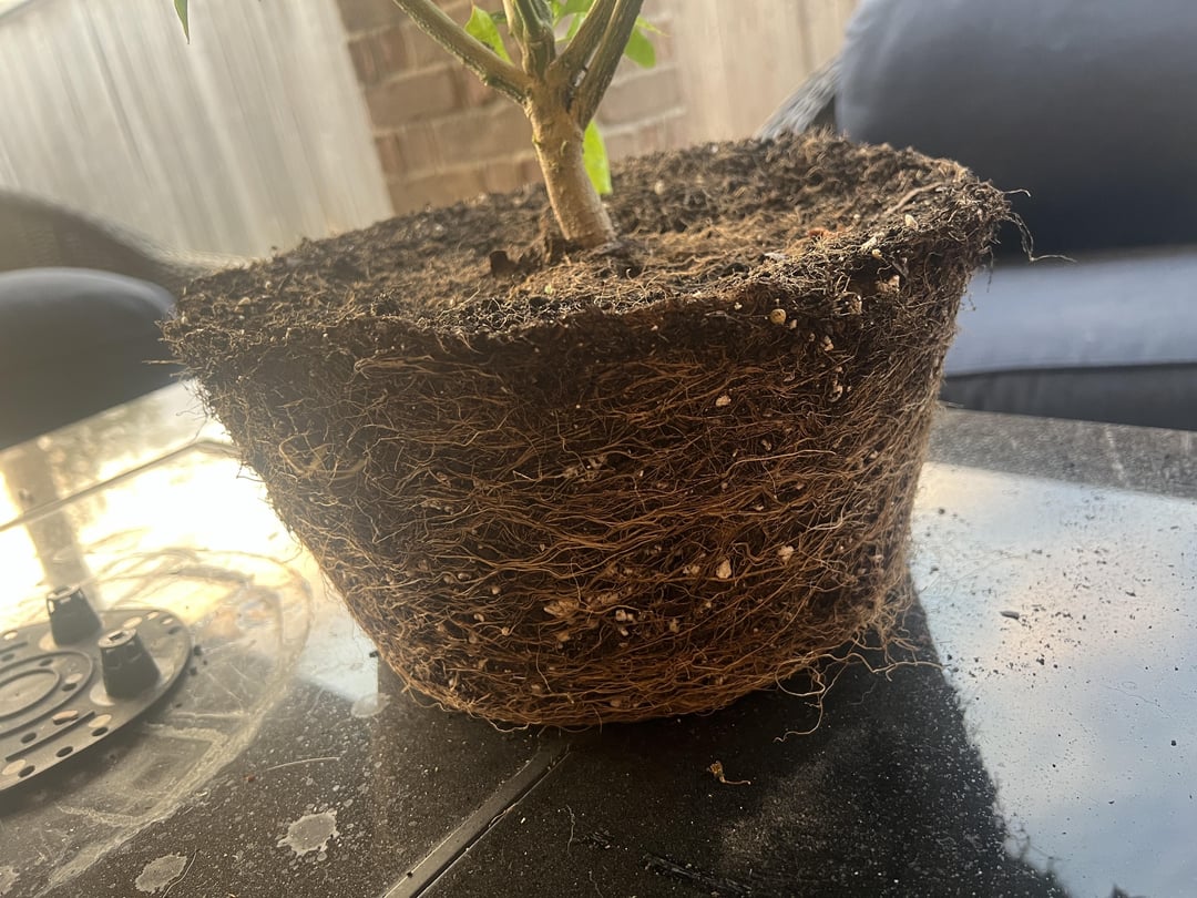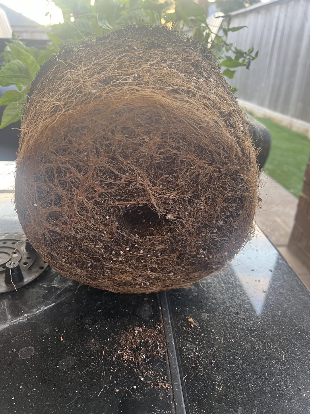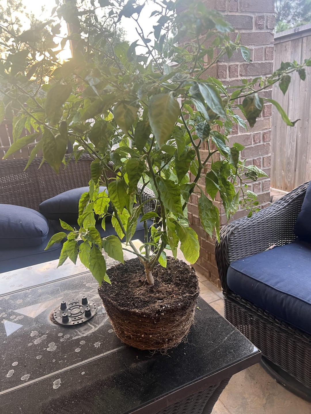 Houston – We woke up to a very windy morning . My Capsicum Pepper plant got knocked down and terracotta planter broke . Seems to me she’s root bound and that could be the reason why I’m not getting any peppers . Will repot her and was wondering if I should mess the roots a bit to give them some air or just repot her in a bigger planter adding some more soil .