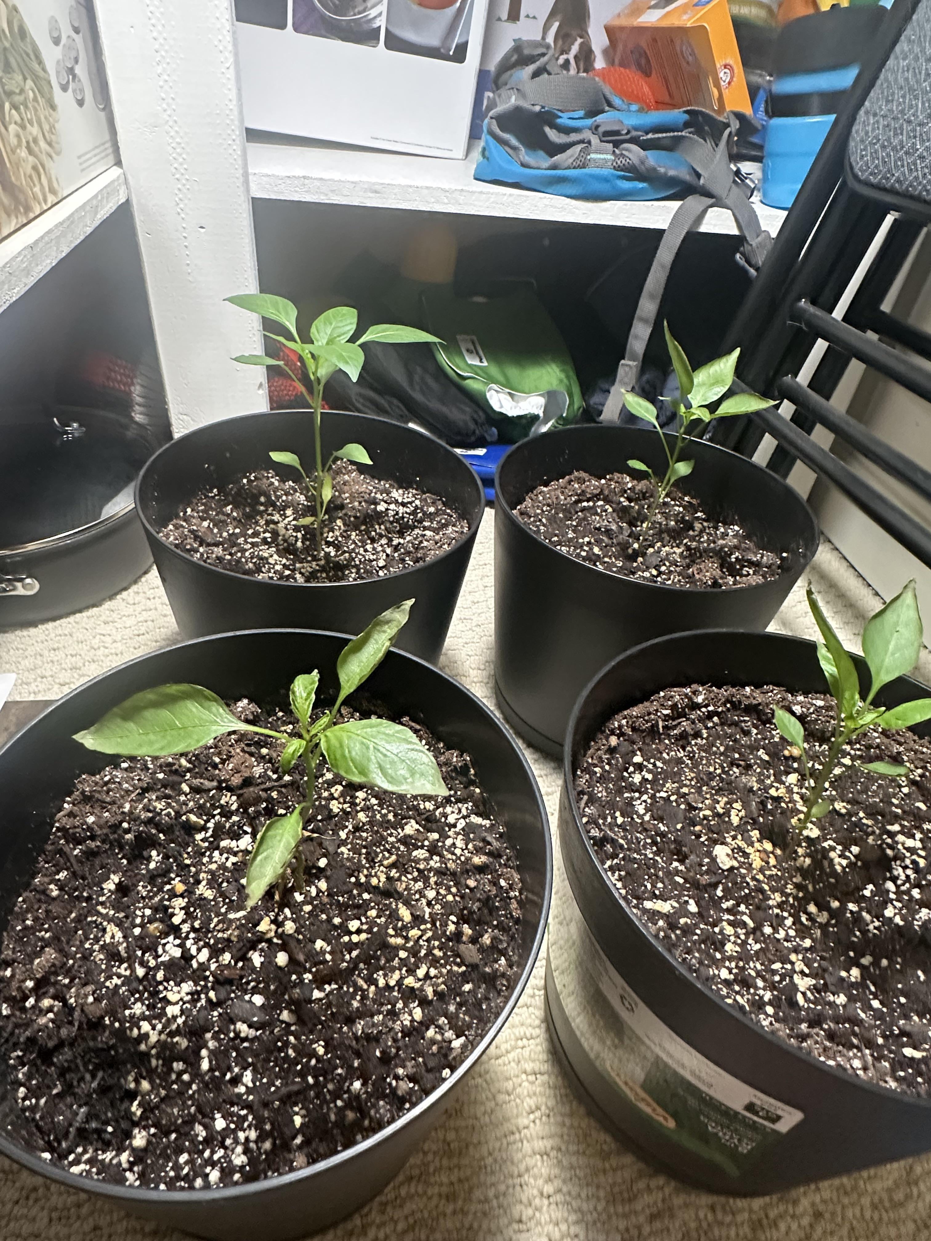 Just transferred these to bigger pots about 2 weeks ago and their leaves are starting to curl and get darker. All except the back left one. I have a grow light on them for 14 hrs a day. I water roughly every couple days. The soil is a mixture of potting soil, perlite, peat moss and it stays pretty wet for a long time. My guess is I’m over watering. Haven’t tried any fertilizers yet. Also considering a fan. The stems seem weak and growth has halted. Any suggestions would be appreciated!
