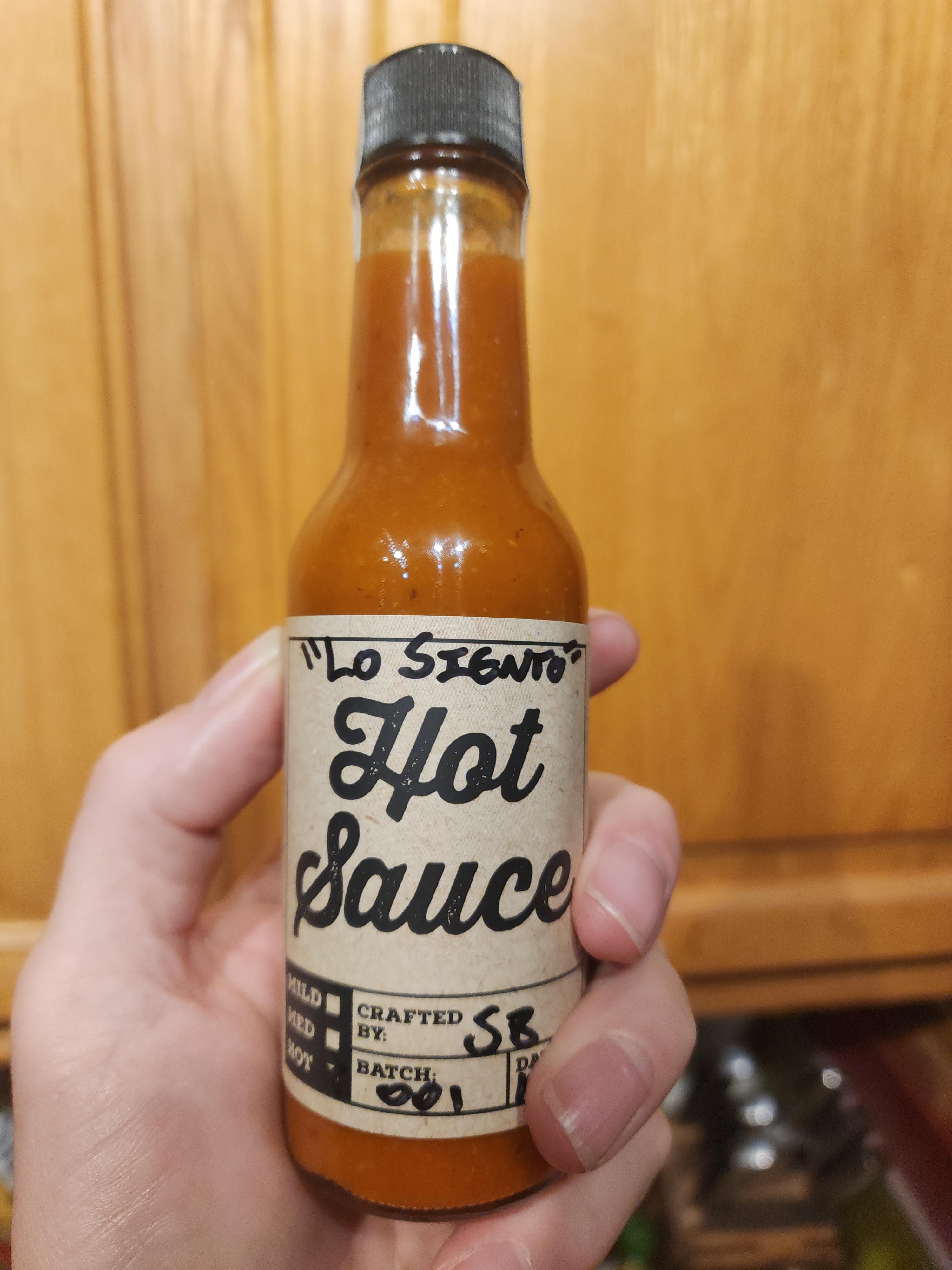 My entry is "Lo Siento". This one hits hard. Fresh Trinidad Scorpion, Habanero, and Lemon drop pepper mixed with roasted garlic, onions, and yellow bell pepper. ACV and some citrus to get the PH right. Blended, strained, and hot-bottled. I believe in flavor first. This one catches up fast with heat nearly immediately after the flavor. If I had 1000 bottles, I would send them to you fine spiceheads. Stay awesome.