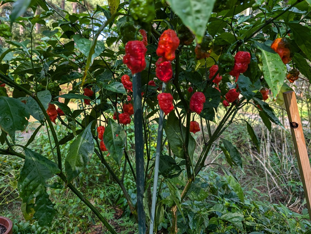 Yes, this is the plant that Helene knocked over; I staked it back up with a bigger stake and it's obviously quite happy. The wooden stake is for a red mushroom plant – I had no idea the reaper would get this big! by FlattenInnerTube Hot peppersPeppersSpicy Stuffsweet peppersWrite A CommentYou must be logged in to post a comment.