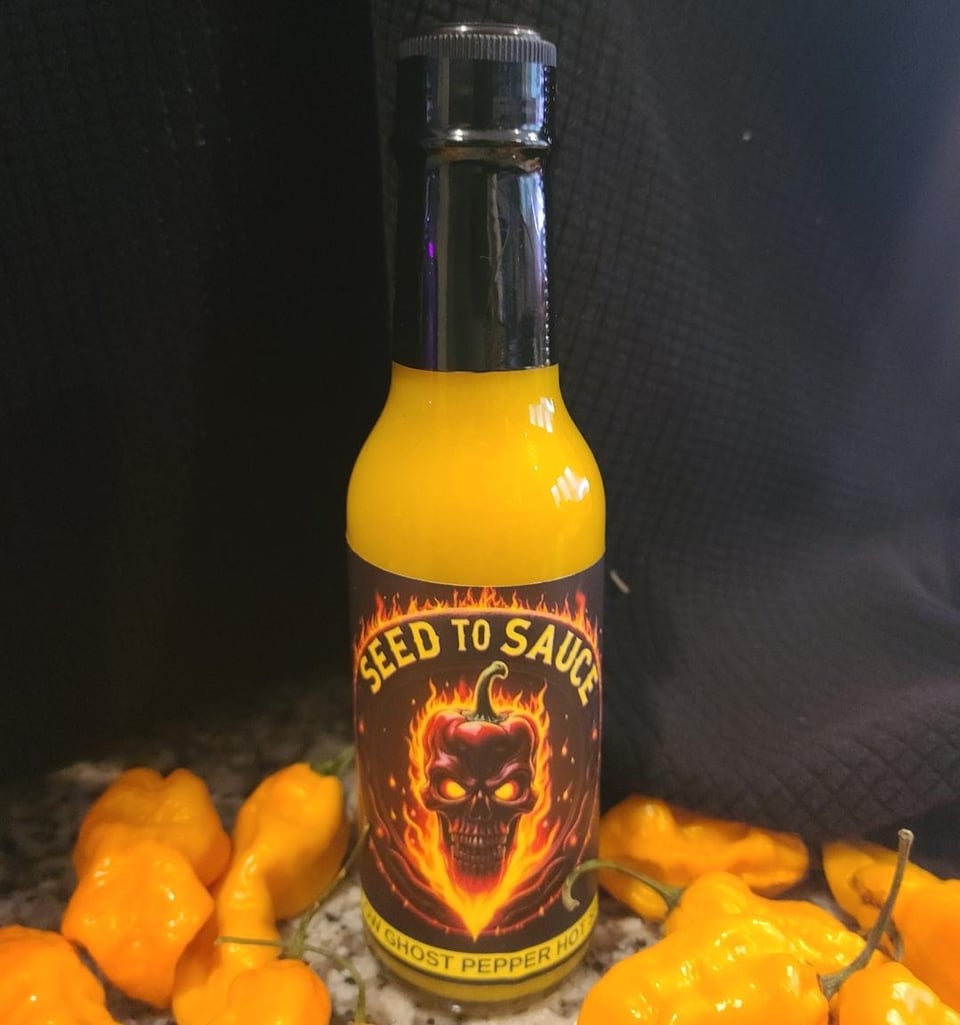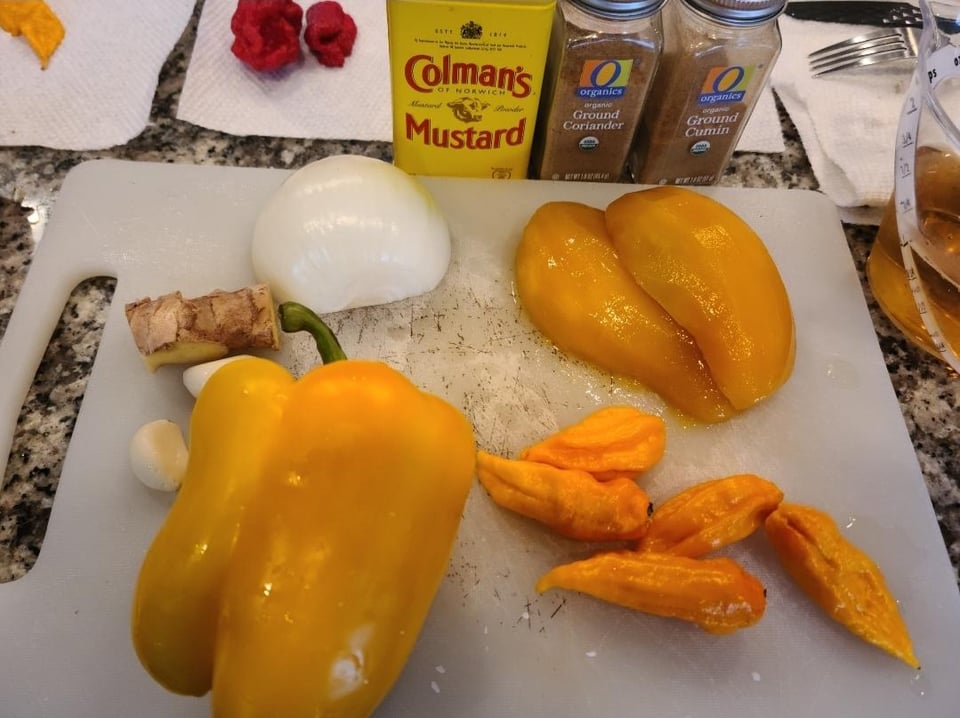 5 yellow Ghost peppers, 1 yellow bell pepper, 1 mango, 1 piece og fresh finger, 2 garlic cloves, half a medium yellow onion, mustard powder, coriander, cumin, salt. 1 cup distilled white vinegar, 1 cup water. SOOOOO GOOOOOD! SOOOOO HOOOOOT!