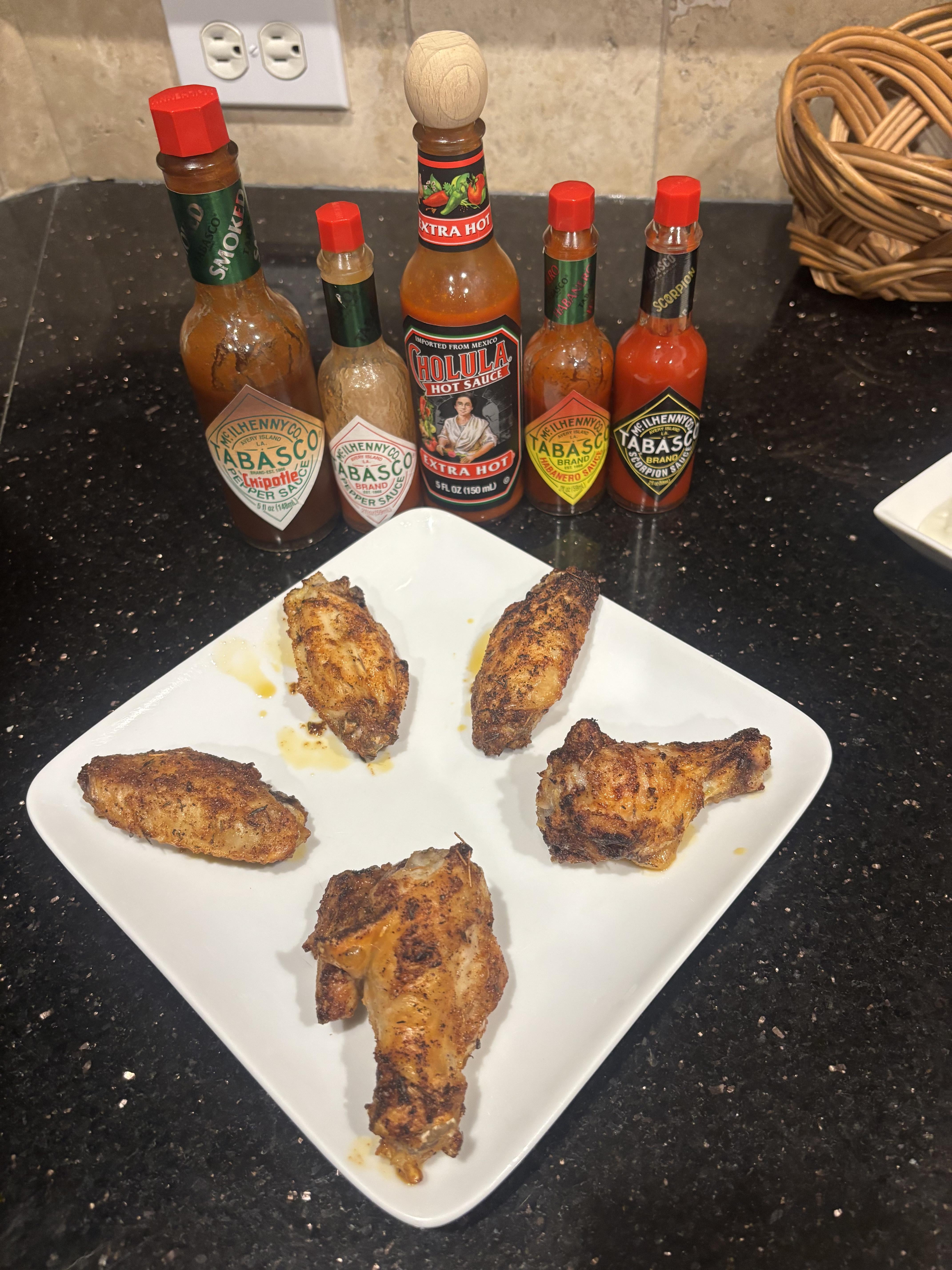 This week I started picking up some sauces and giving my palate a bit of a workout. I just found a fresh restock of Tabasco Scorpio. At the store today and figured dinner tonight would be a little wing gauntlet. Before each wing, I had 3 drops of each sauce on a spoon as a palate preparer. Then each bite got 6-8 drops of sauce.