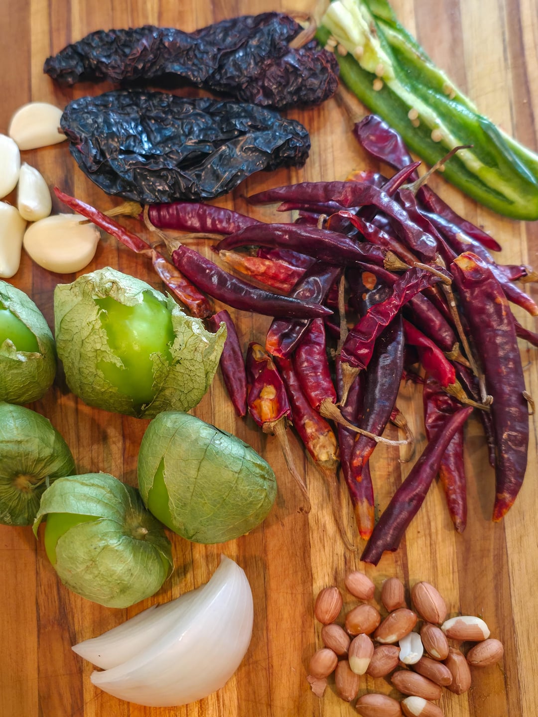 – 1/3 cup Neutral Oil – 1.5 cups Water – 20-25 raw Peanuts – 35 Arbol Chiles (Stems cut Off) – 1 Large Jalapeno (Diced) – 2 Ancho Chiles (Remove Stems / Seeds) – 1/4 White Onion (Julienned) – 4 Garlic Cloves (Large Dice) – 3-4 Tomatillos – 1 tsp Salt