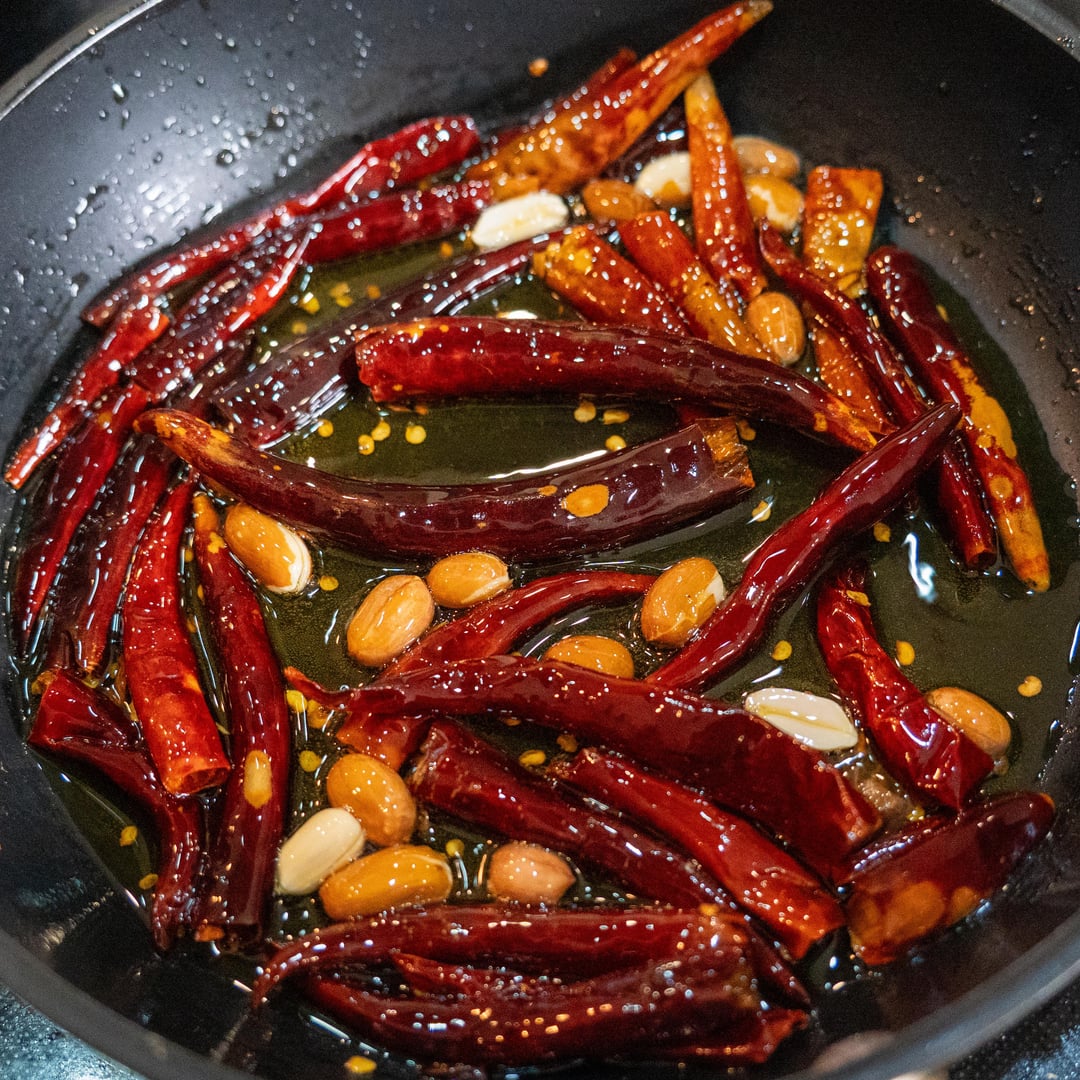 – While anchos are soaking, heat oil to low / medium. Add arbols and peanuts, cooking for roughly 3-4 minutes. Make sure not to burn.