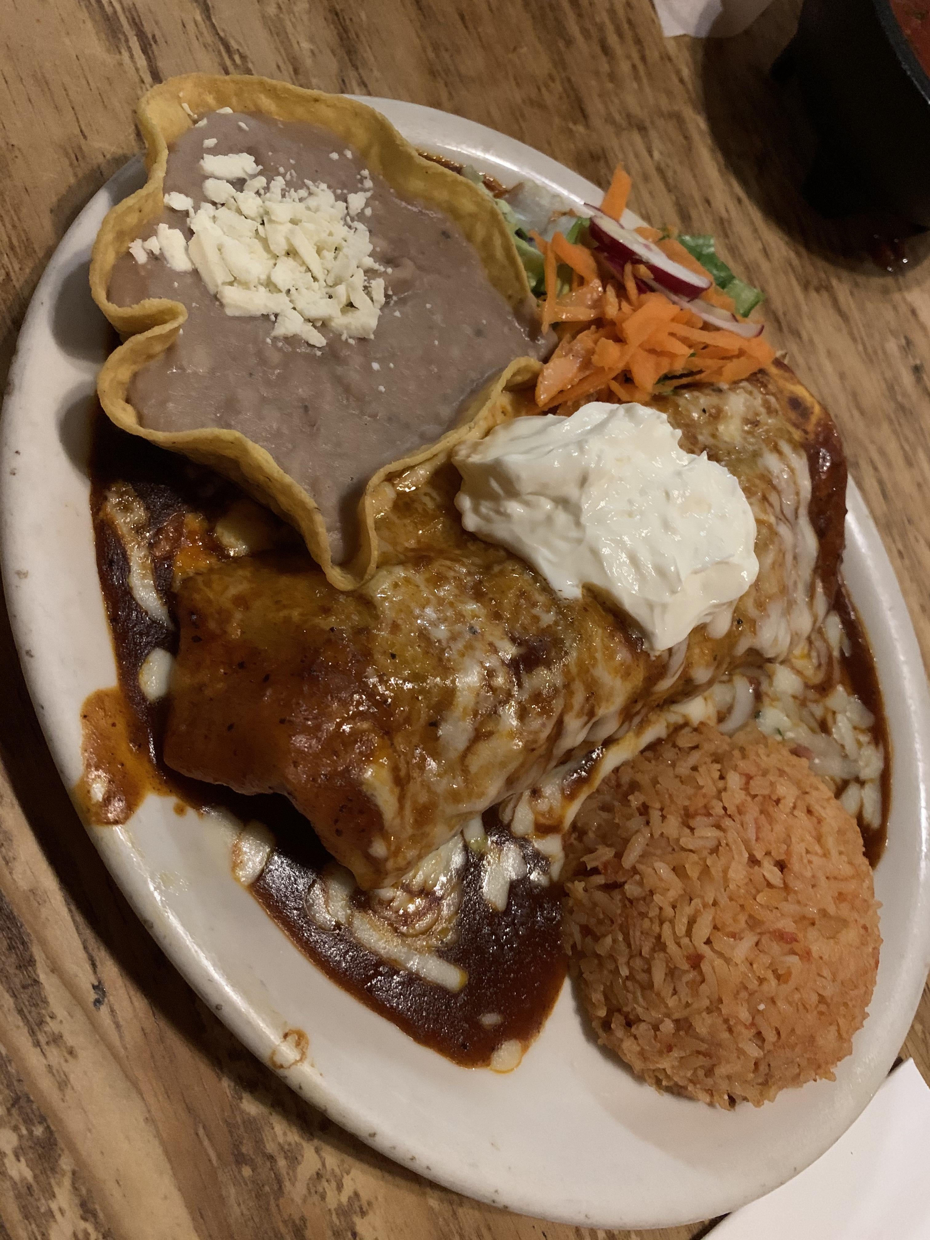 They call themselves a Mexican restaurant. It should be a crime to serve this as Mexican food. Rice was dry. WTH is the carrot radish side? And the Crema fresca was thick! Ugh.