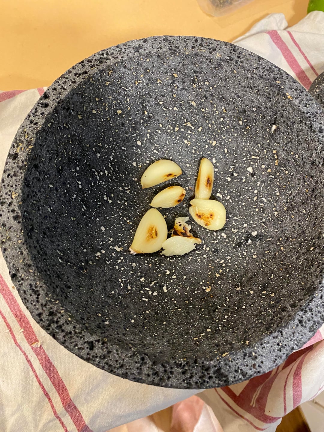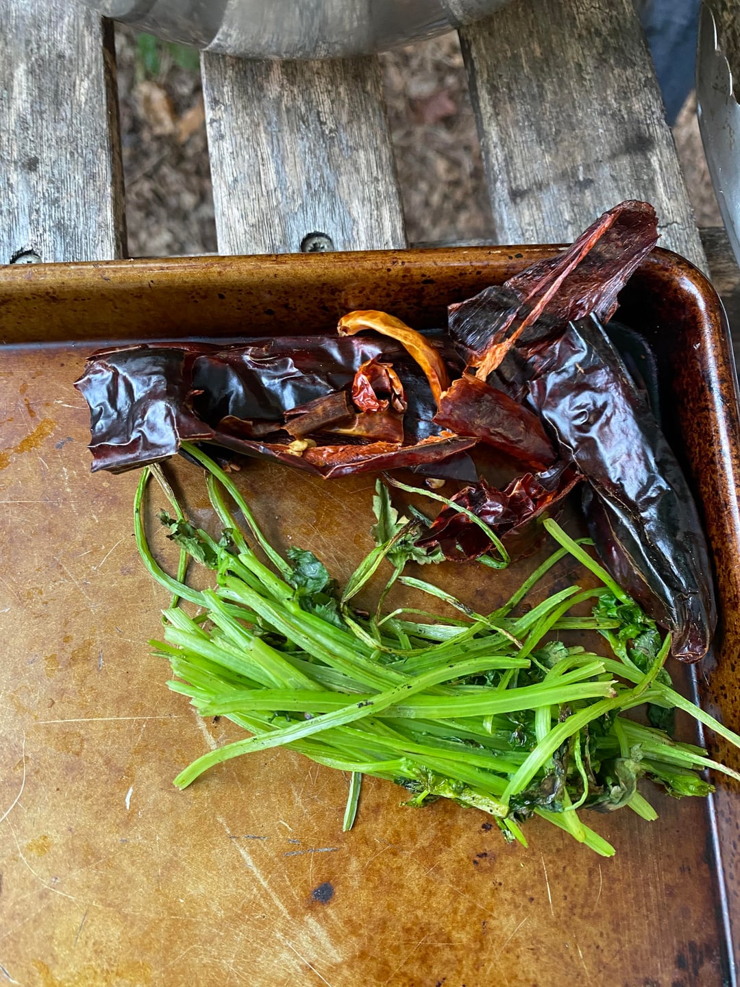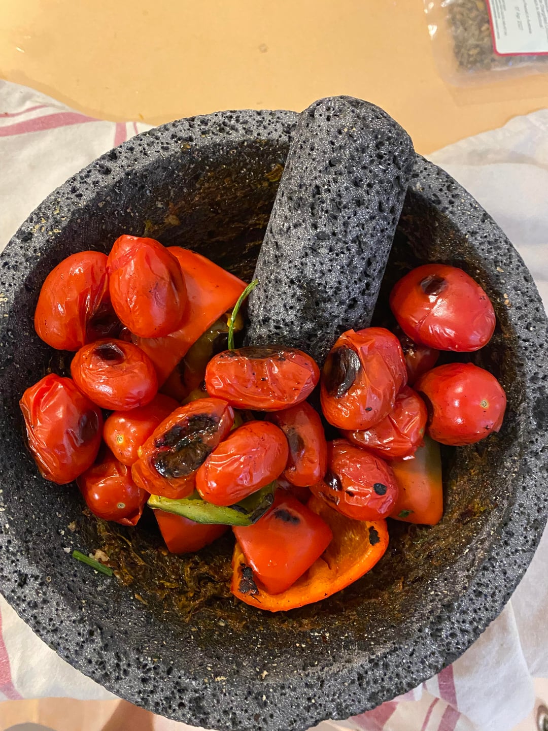 Recipe: on plancha, roast chiles arbol and guajillo, cherry/grape tomatoes, capsicum, garlic, red onion, coriander root and stem