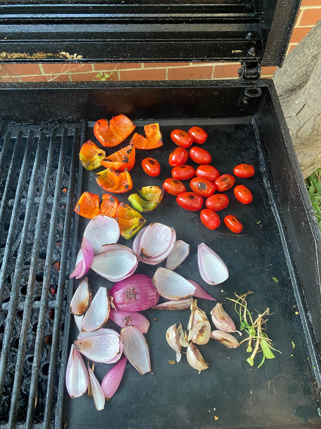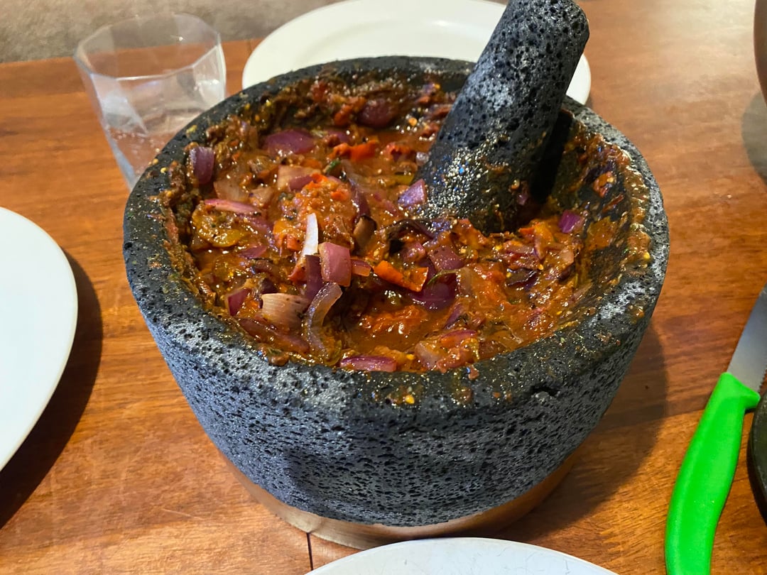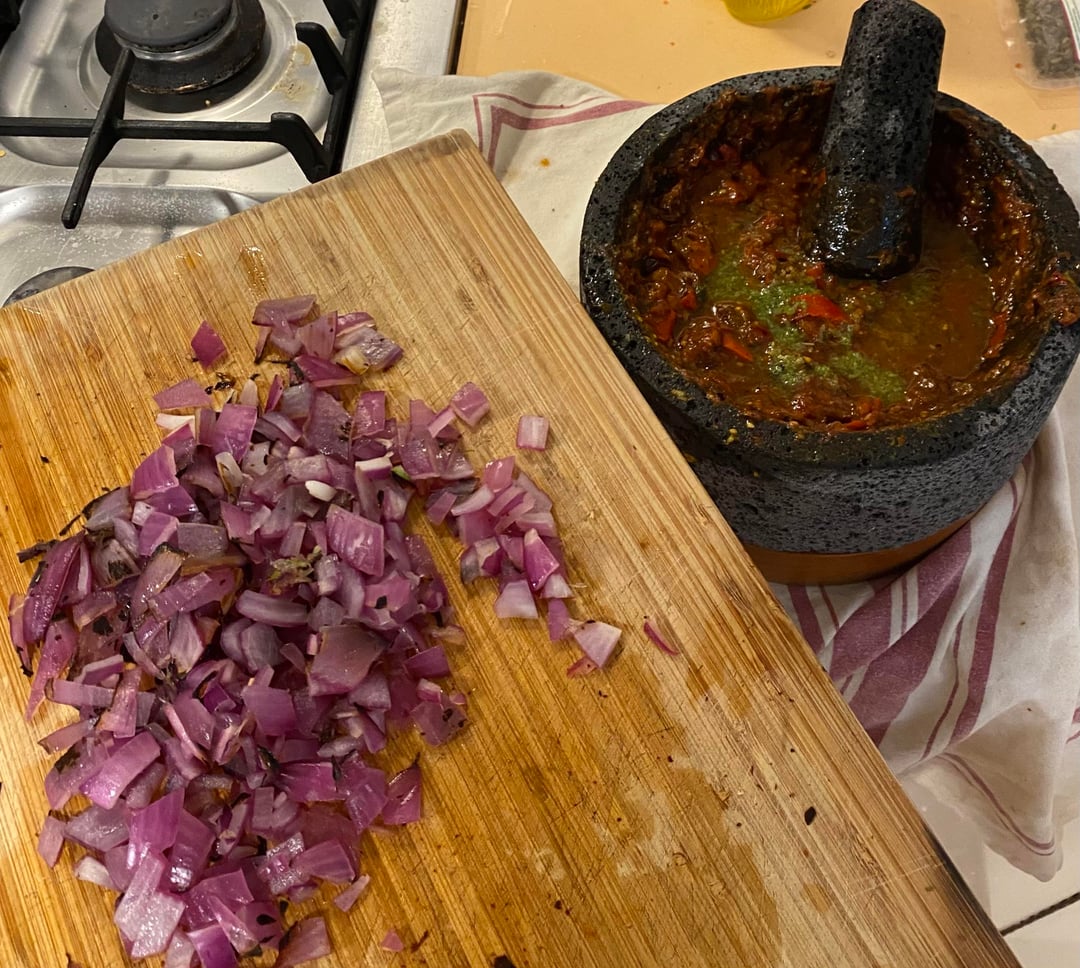 Recipe: on plancha, roast chiles arbol and guajillo, cherry/grape tomatoes, capsicum, garlic, red onion, coriander root and stem