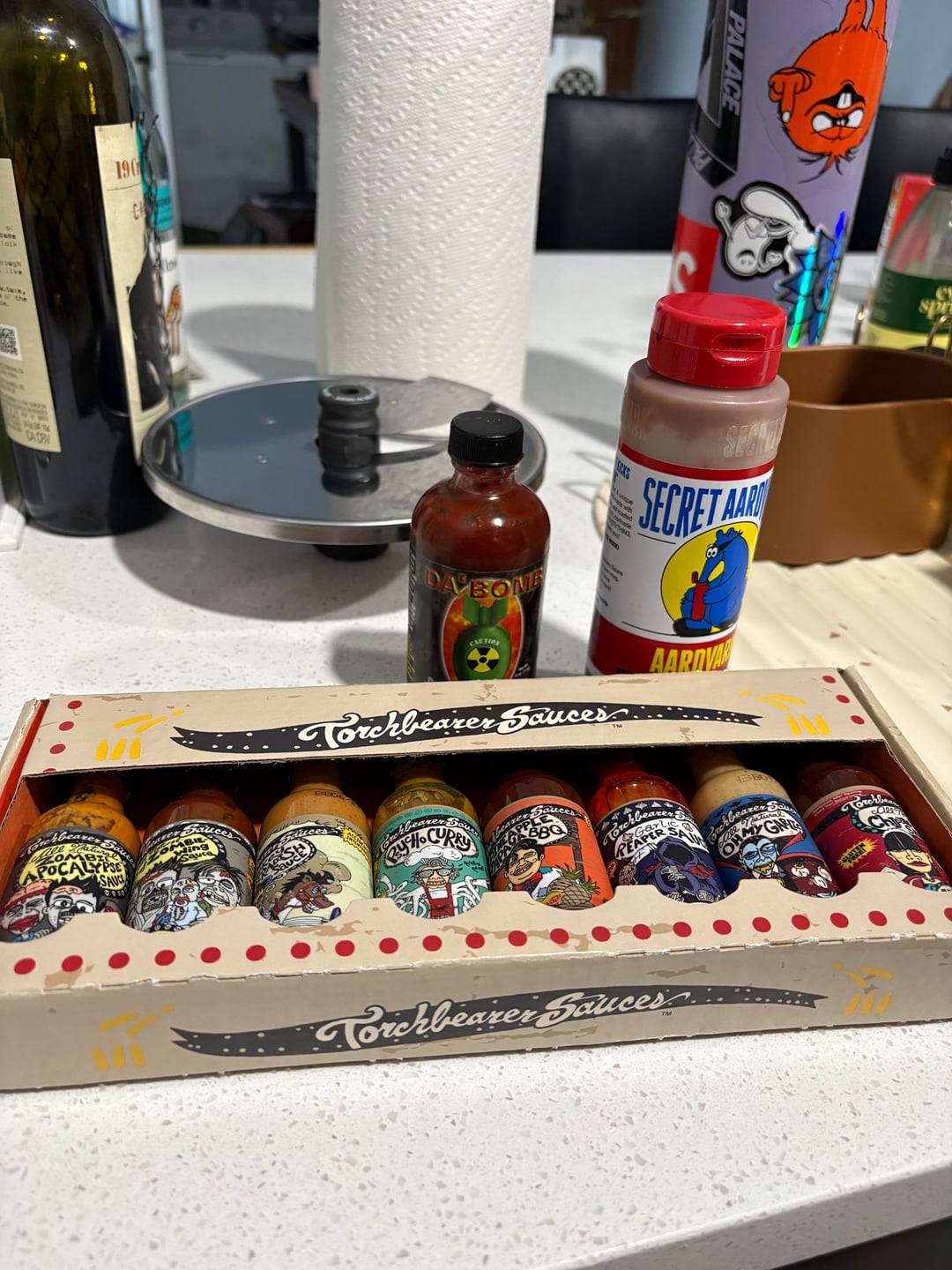 This sub has been popping up on my feed the past few weeks. Haven’t bought any hot sauce other than Franks, Texas Pete’s, Duffs, Anchor Bar & Picasso’s in the past 6 years. Scored a nice lil mini haul of sauces I’ve never had, and a couple candies for $53 shipped. Already got into the Secret Aardvark and Da Bomb