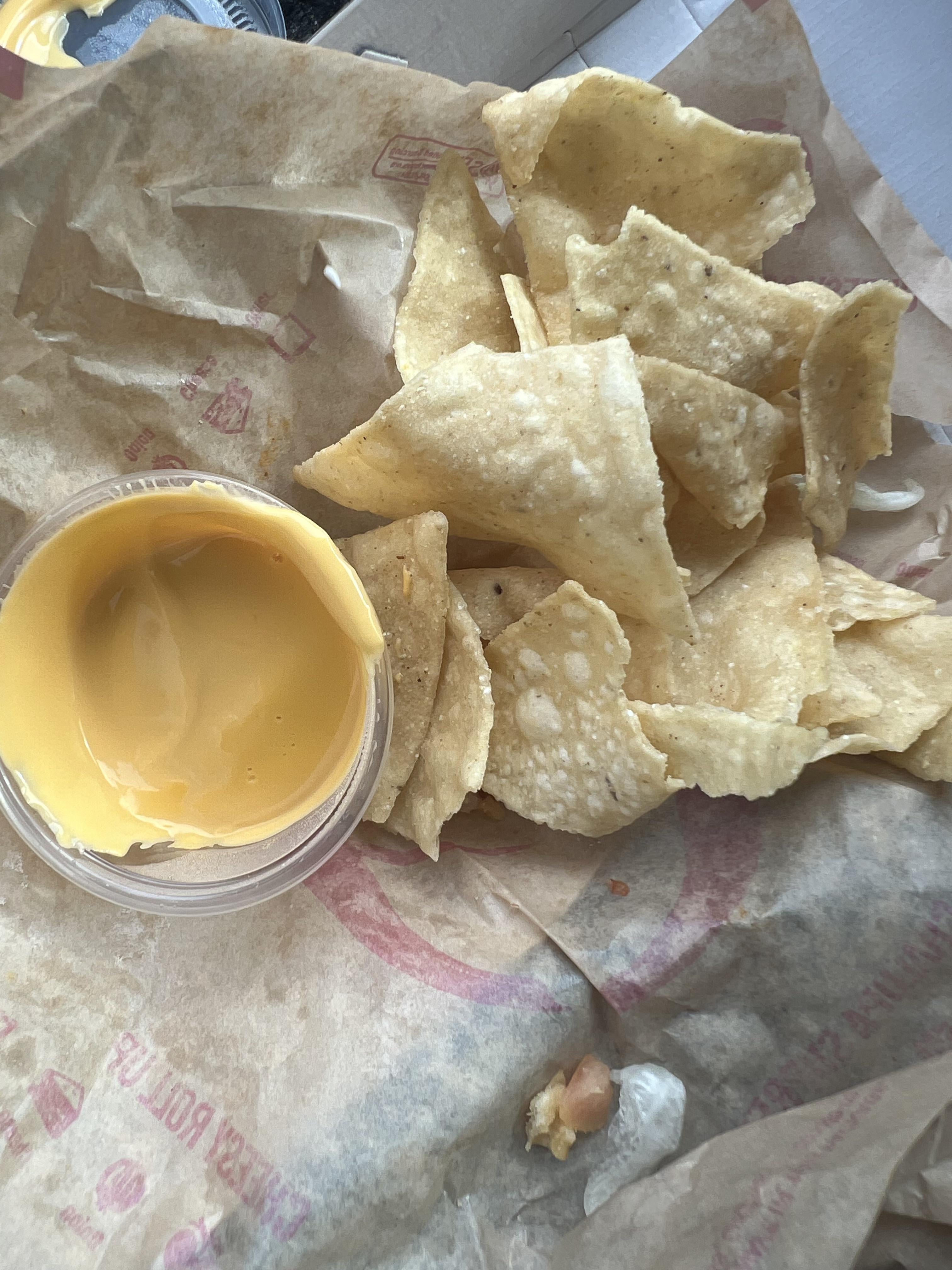 I had a reward for chips and queso and this is all I got. I was running late to work so couldn’t turn around and complain. Taco bell employees need to do better, i spend my hard earned money to even get a reward in the first place.
