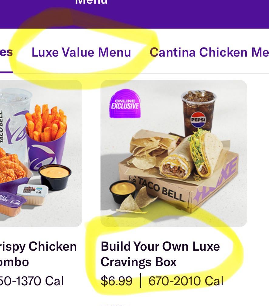 Calling everything Luxe now is frying me. Because give me a basic cheap box idc it’s literally Taco Bell.. by Fluffy_Try2377 taco bell 5 Comments Shivathewriter 7 days ago Ok Diligent-Cat-8159 7 days ago The fact that the build your own luxe box is 6.99 when it has one less item then the 7 dollar luxe box is just outrageous. Bo_flex 7 days ago Damn. That same box for me is 9.99! Fuzzy_Welcome8348 7 days ago You are luxe PretendBrain115 6 days ago The five layer burrito isn’t even an option where I live even though they use it in the ad photo just like this 😂😂Write A CommentYou must be logged in to post a comment.
