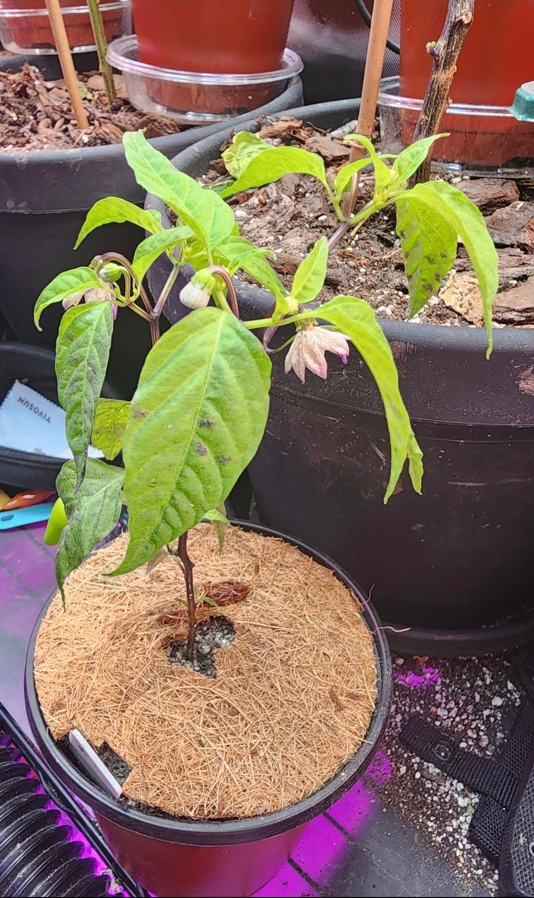 My plants in the 6" pots are 6-10" tall now and starting to put out flowers. Didn't expect this one to actually start fruiting given how juvenile these all are still. It is a smaller pod variety (I think 2-3" at most). Gonna let it grow since im not in a hurry for all of these plants to be 3 feet tall by February.