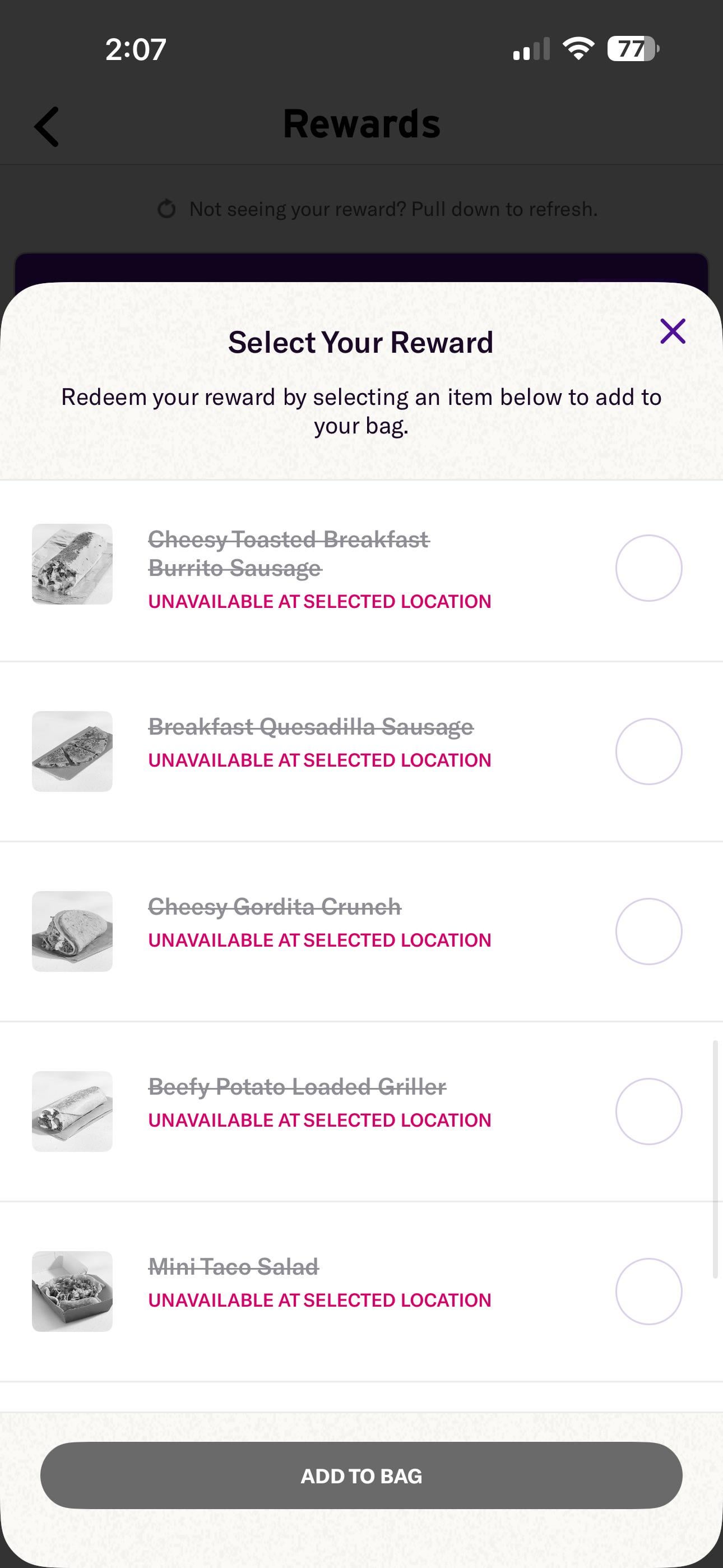 This has been like this for weeks now. Most of the fire rewards say unavailable, despite me being able to order these in the regular way. I need a free beefy potato loaded griller by Momobiz999 taco bell 2 Comments OctagonTrail 2 days ago Some locations just opt out of rewards entirely. It’s a “price and participation may vary” situation. Annoying but legit. Fuzzy_Welcome8348 2 days ago Try another locationWrite A CommentYou must be logged in to post a comment.