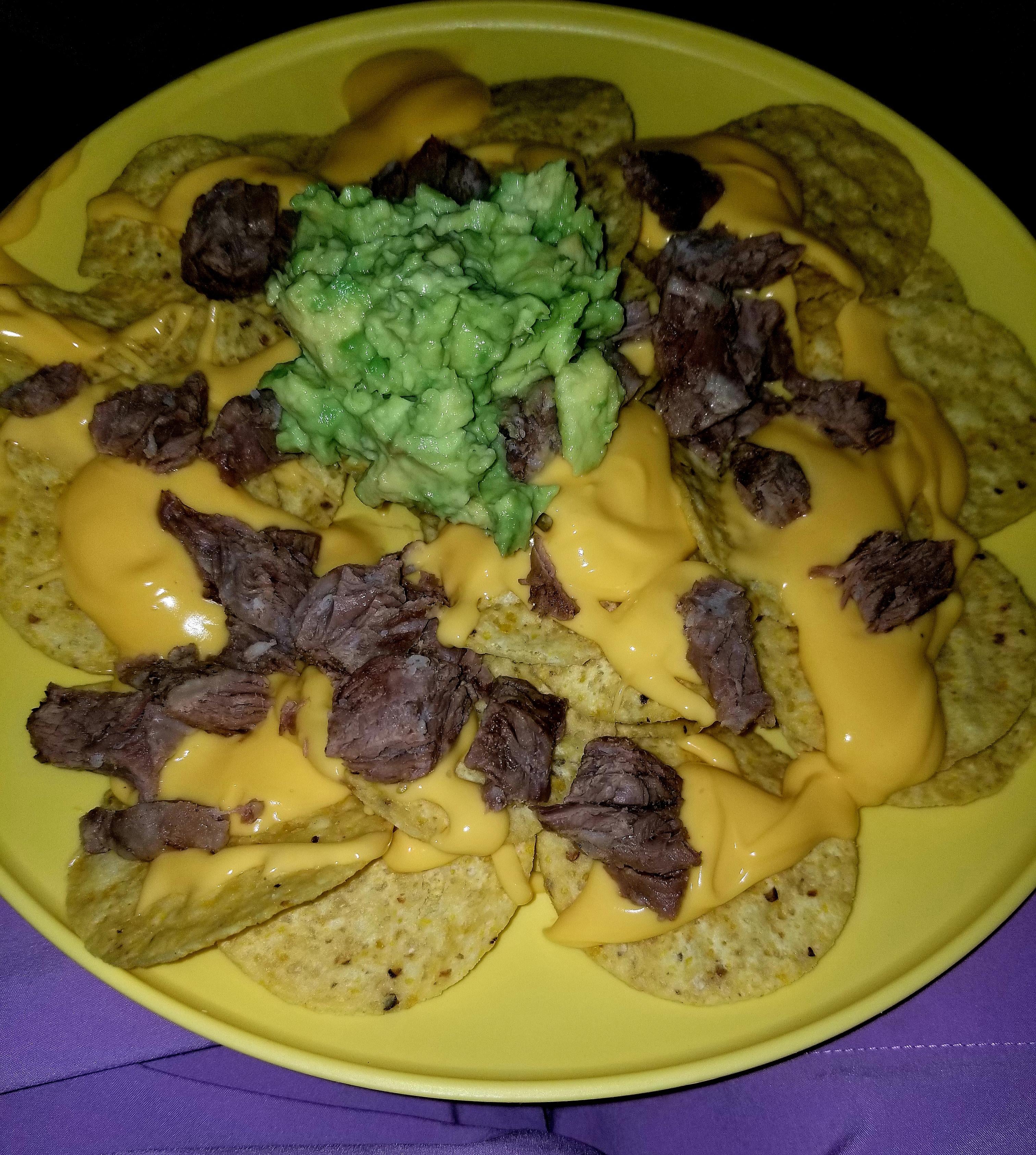 I just finished making Fajita Nachos topped with Avocado.