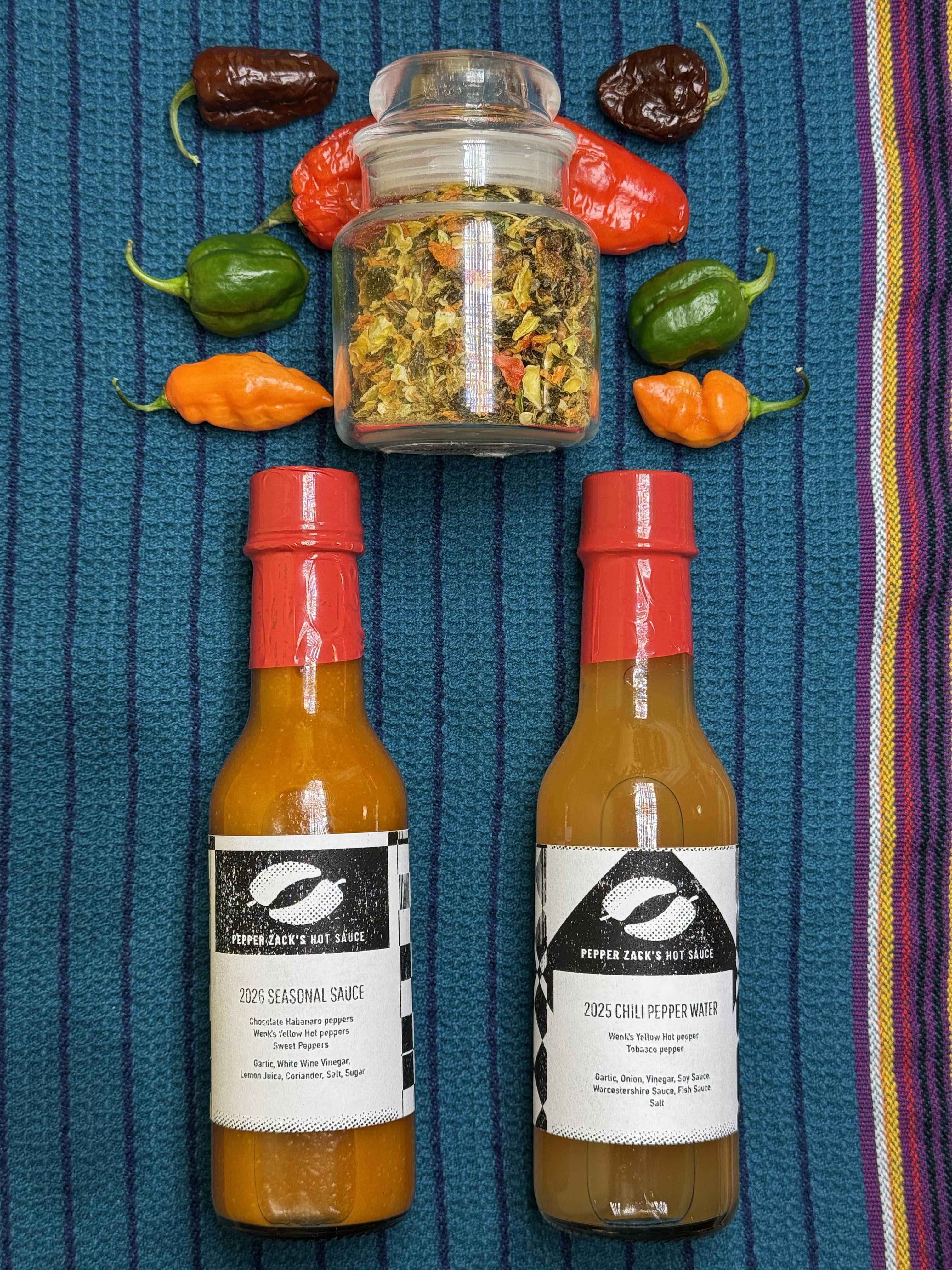 Made my ‘26 seasonal batch of 4 bottles. Alongside my small batch of chili pepper water. Crappy laser printer labels to boot!