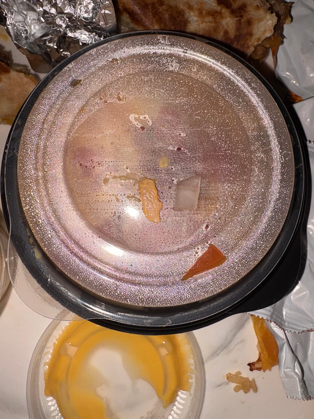 So, I’m going in my food and about to get into the glorious liquid gold that is their nacho cheese when I see something sticking out of the top. I’m immediately like wtf is this??? I use a chip to pull it out and this is the atrocity that I see. I’m beside myself now that my appetite has been ruined. I’ve reached out to customer service and no one has gotten back to me. Now, I’m a Taco Bell champ. I know what I’m getting myself into when I order from there. But I never signed up for mystery meat in my nacho cheese.