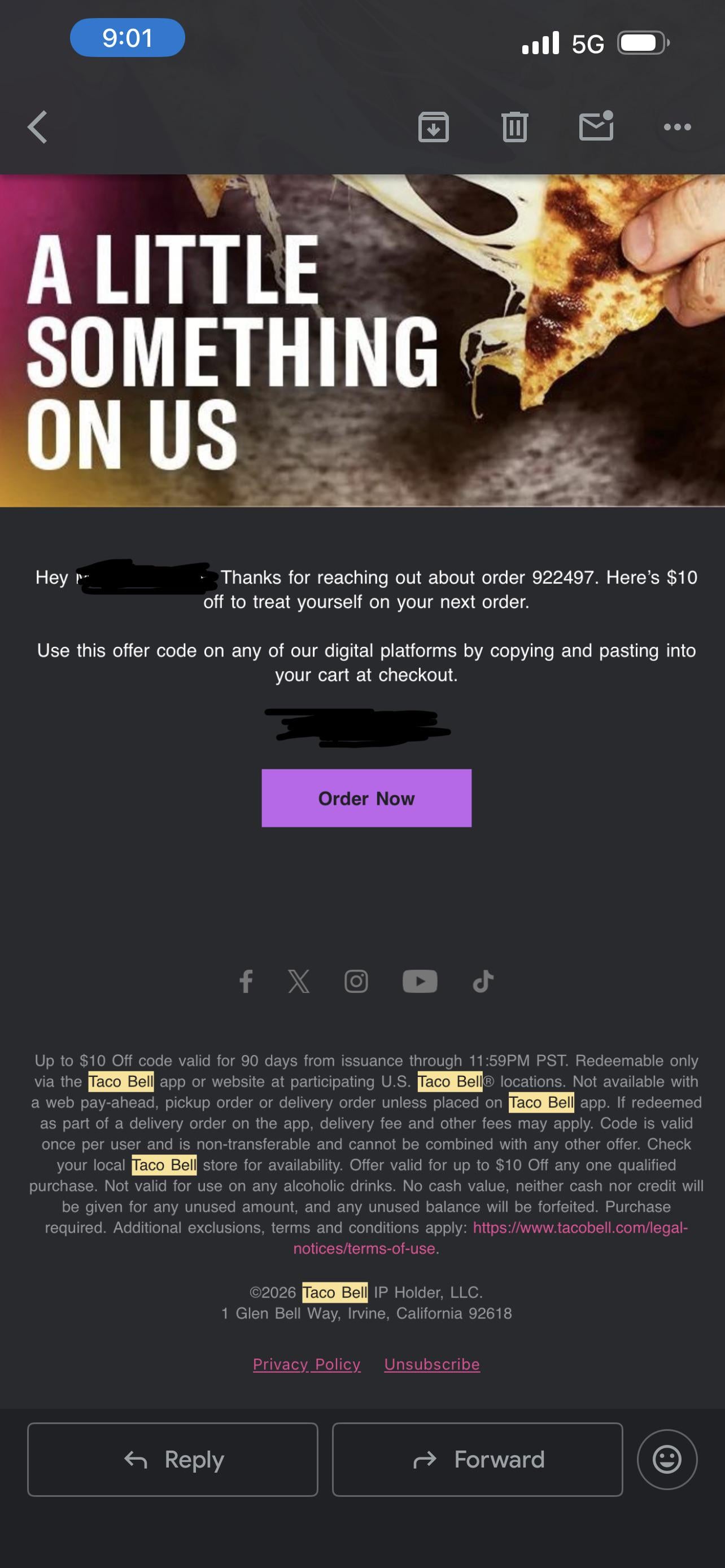 Got taco bell at 2 am couple nights ago everything was great until I opened my 6.50 steak nacho fries and there was literally 0 steak… I usually dont complain but when something cost 7 dollars after tax I cant let that slide😂. Contacted them bout the issue then I see this in my email. Honestly would have forgot about it if it didn’t so happen to be checking for something else. W taco bell gotta give credit where its due, there was an issue and they made it right💯
