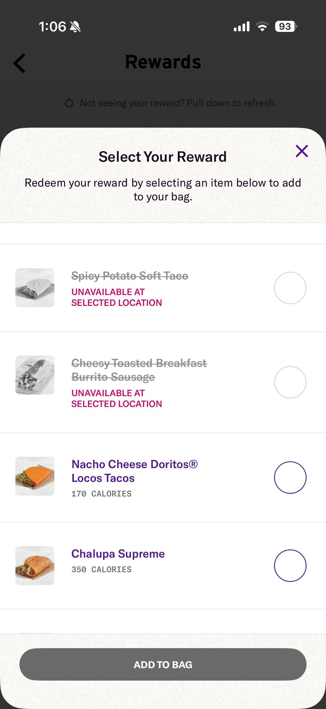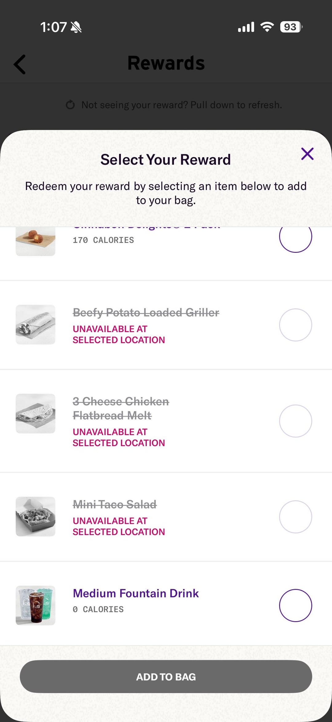 Good lord I miss getting that free chicken enchilada burrito but this just pisses me off since the other things I’d pick instead like spicy potato or 3 cheese flatbread are just greyed out despite being on the menu..what gives?