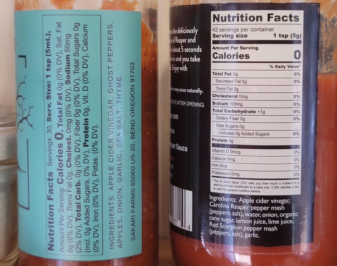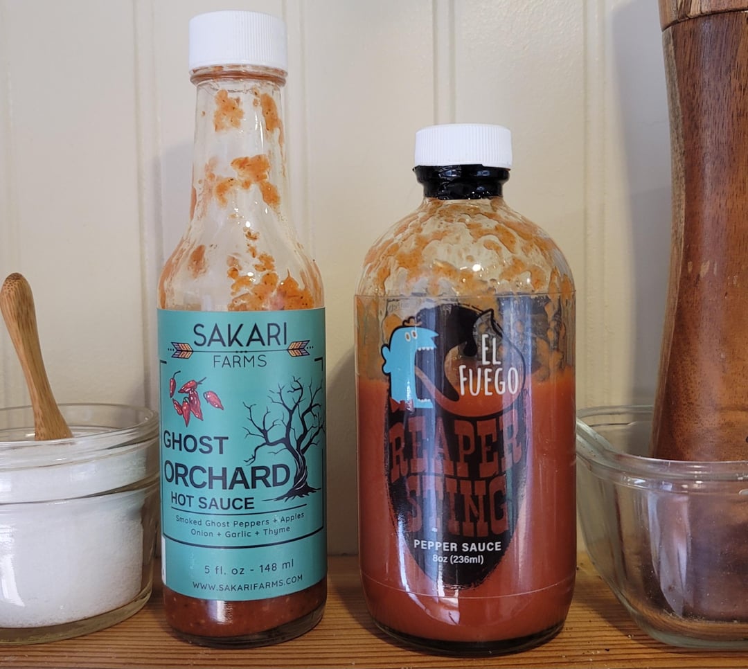 What did catch my eye were these two: Sakari Farms Ghost Orchard, and El Fuego Reaper Sting, and mostly because they were apple cider vinegar-based. My partner once pickled three gallons of apples from our tree, so I made a few batches of sage habanero hot sauces using the pureed apples as a base. It wasn't my favorite sauce I've made, and I've always wondered if an apple-based sauce could be any good.