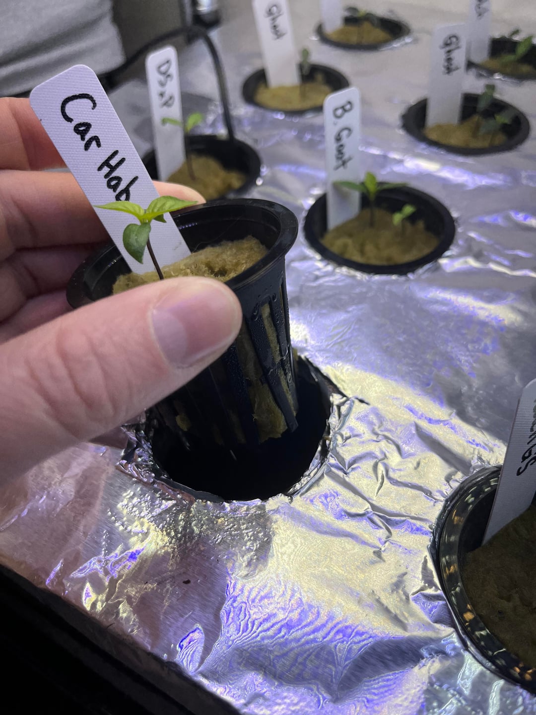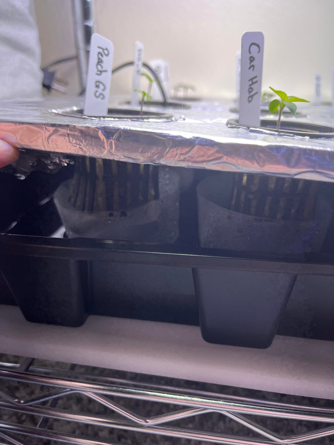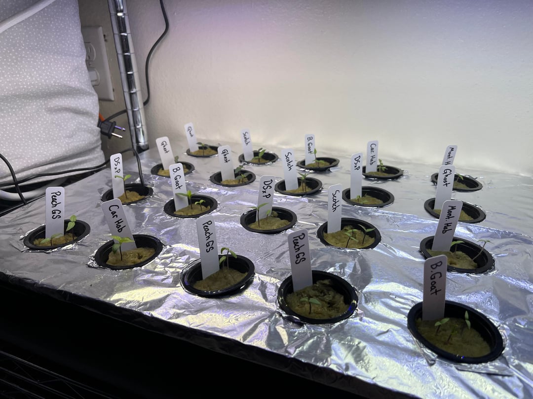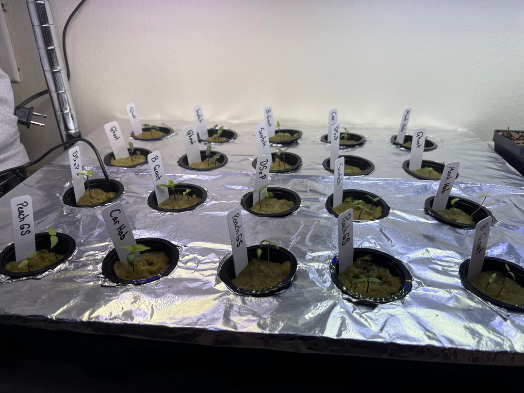 I’ve been a fan of spicy things for a very long time and have come to deeply enjoy watching everyone grow crazy hot peppers so I decided I’d give it a shot. Here’s about 8 varieties of seeds all purchased from White Hot Peppers. They were soaked in hydrogen peroxide, then 3% potassium nitrate, thoroughly rinsed, and sown into rock wool cubes soaked in distilled water. After germination I went into a small kratky system. Each net pot has its own nutrient container so roots don’t get tangled up. I control temp with a seed mat and thermostat and each nutrient cup sits in a reservoir of water that is controlled by the thermostat. I will resize this setup once more root mass appears and then move to soil in about 8-10 weeks. Hope y’all like my setup.