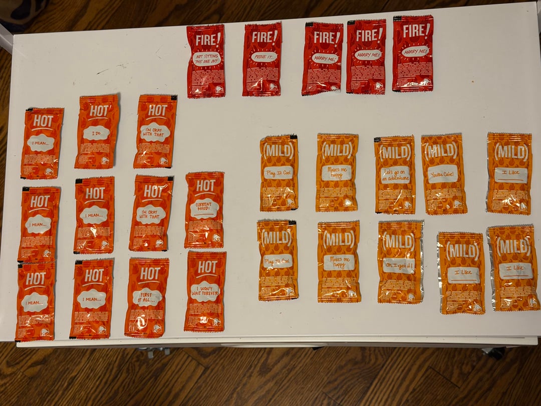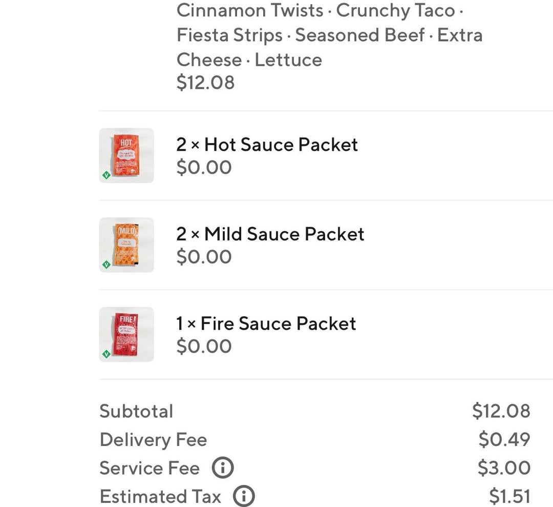 ImaginationSad2803 5 days ago Same. I’ll ask for 2-3 milds and I’ll get 15. I use them in my bean burritos at home when I’m too poor for Taco Bell.