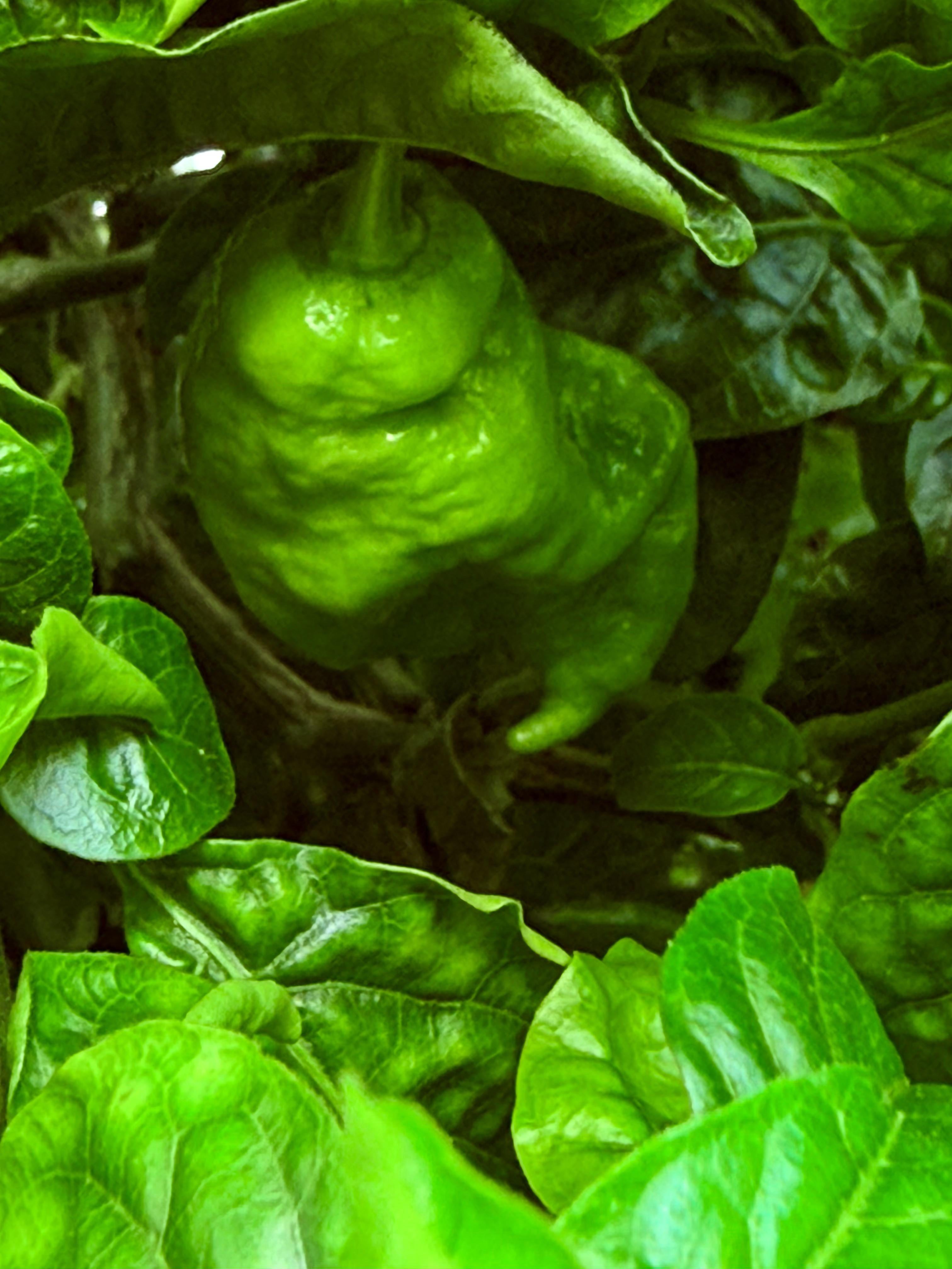 These things are insane on the heat. More Chocolate Primotaliis coming in. This plant likes to hide them, but it’s loading up under the canopy. This one looks a bit more on pheno than the ones resembling a cat turds and chocolate versions of Leviathan Gnarly Scorpions. Pod phenotypes can vary widely on the same plant which is why labeling is of such importance. These are from Pupper’s Peppers as are the Chocolate Reapers and (soon I’m hoping) Chocolate Razorbacks.