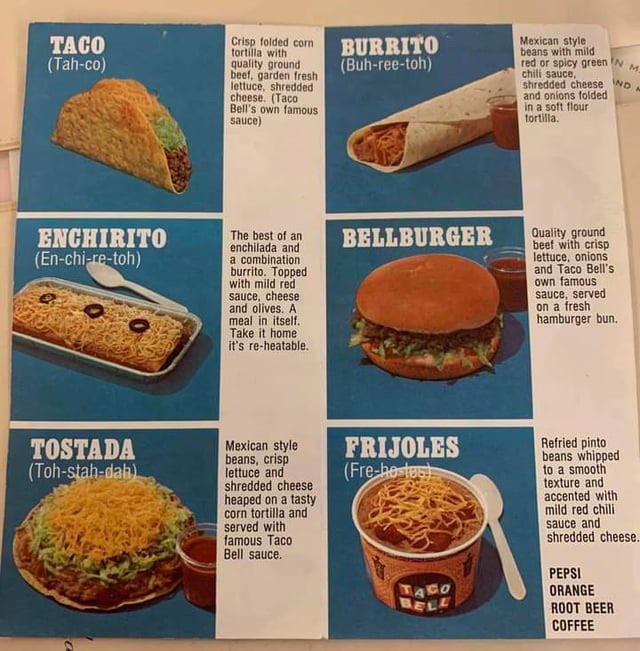 Taco Bell menu in the 1980sby Scorpio1992__ taco bell 5 Comments charlielarae 3 hours ago I wonder what their famous sauce was for the burger? Fuzzy_Welcome8348 3 hours ago When life was worth living timmy_tugboat 3 hours ago I can still order a pintos and cheese and they will make it like that, but smaller. Honestly the most nostalgic thing on the menu. Rekanize90 3 hours ago “Orange” lol Caitbait717 3 hours ago I miss the tostada more than anything. Just make it at home at least once a week.Write A CommentYou must be logged in to post a comment.