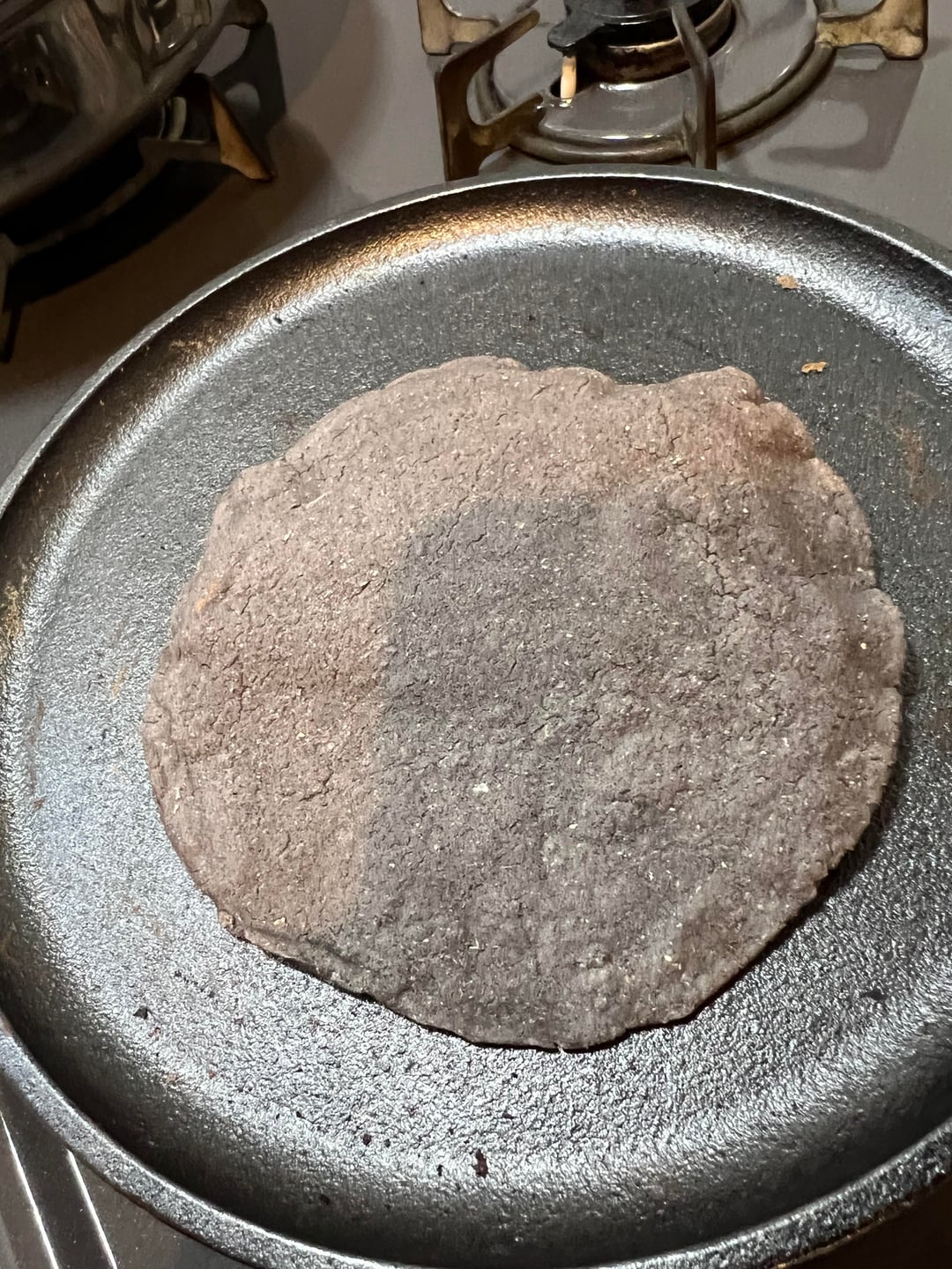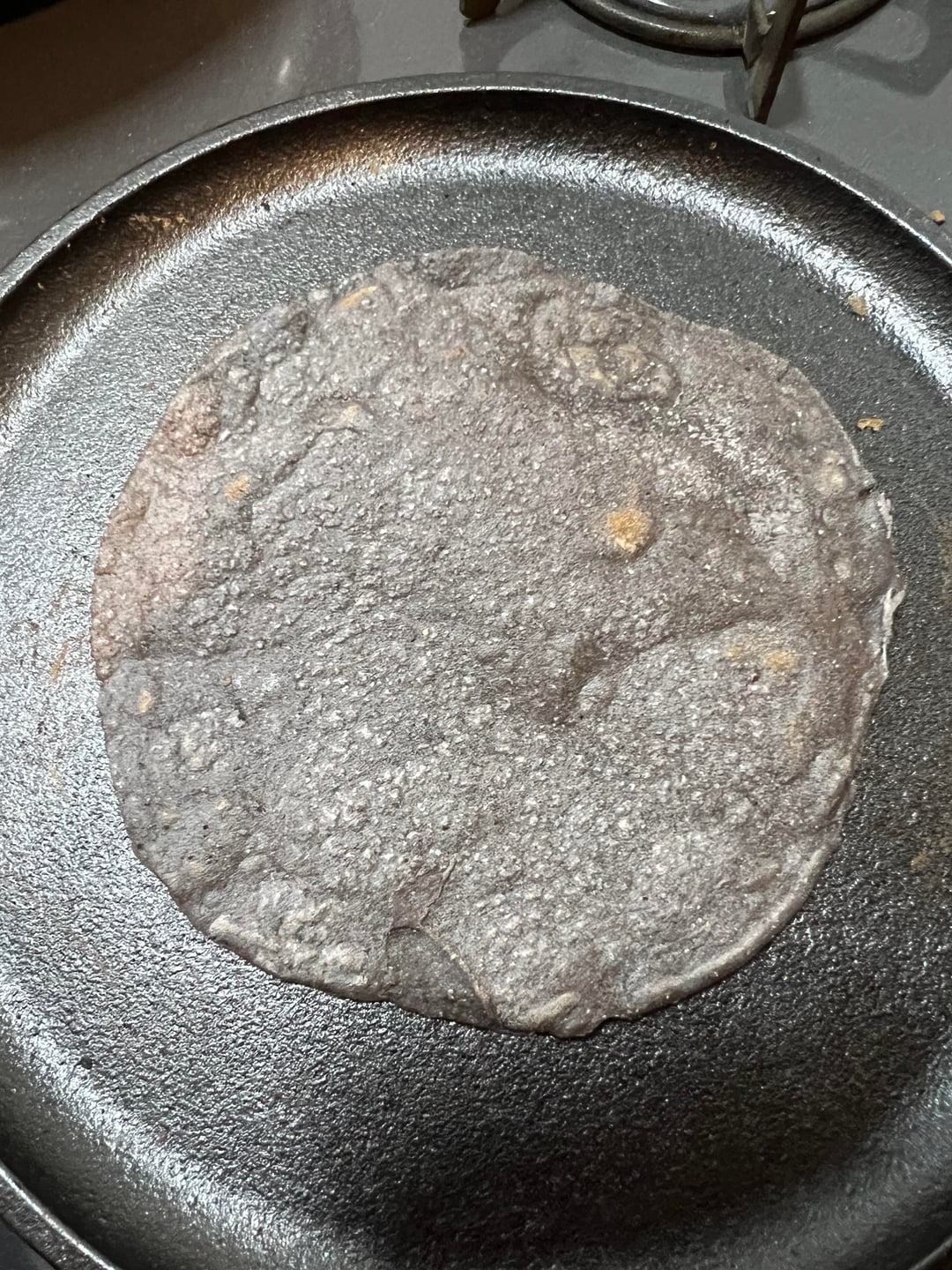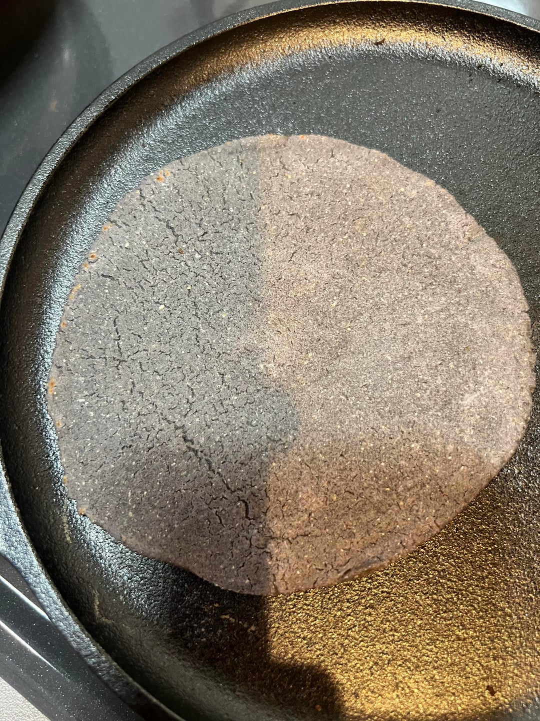 Thanks to everyone who helped with my cast iron question. The Lodge works much better than my stainless steel pan, partly because it's a griddle which makes it easier to flip. I'm still having issues with one side being drier than the other. Is this just because my dough is too dry overall? Or the pan is too hot?